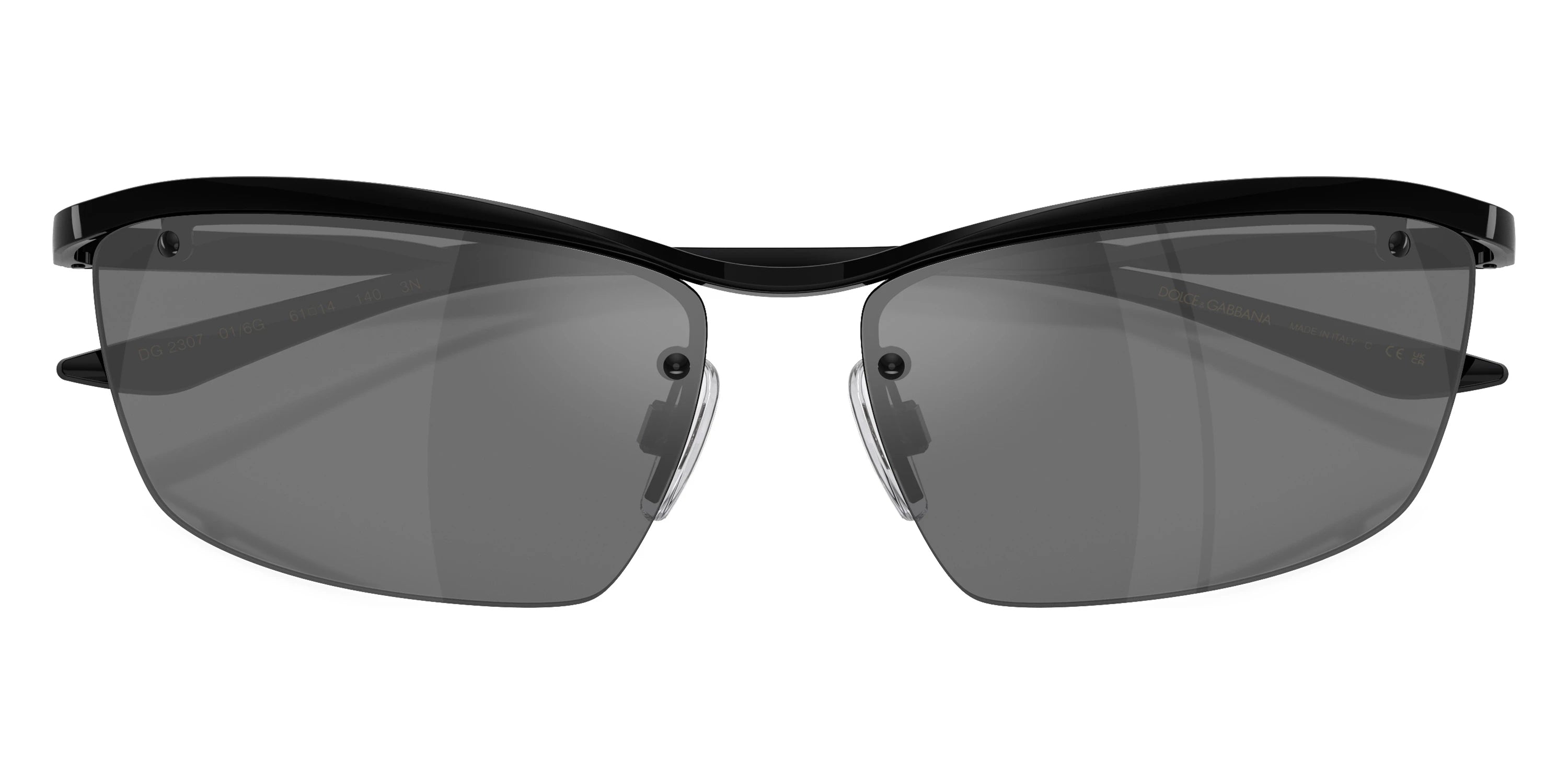 Black (01/6G) Sunglasses with Gray Mirrored Black lenses (DG2307 01/6G 61) by DOLCE & GABBANA™. Size: 61-14-140, Shape: Rectangle, Material: Metal.