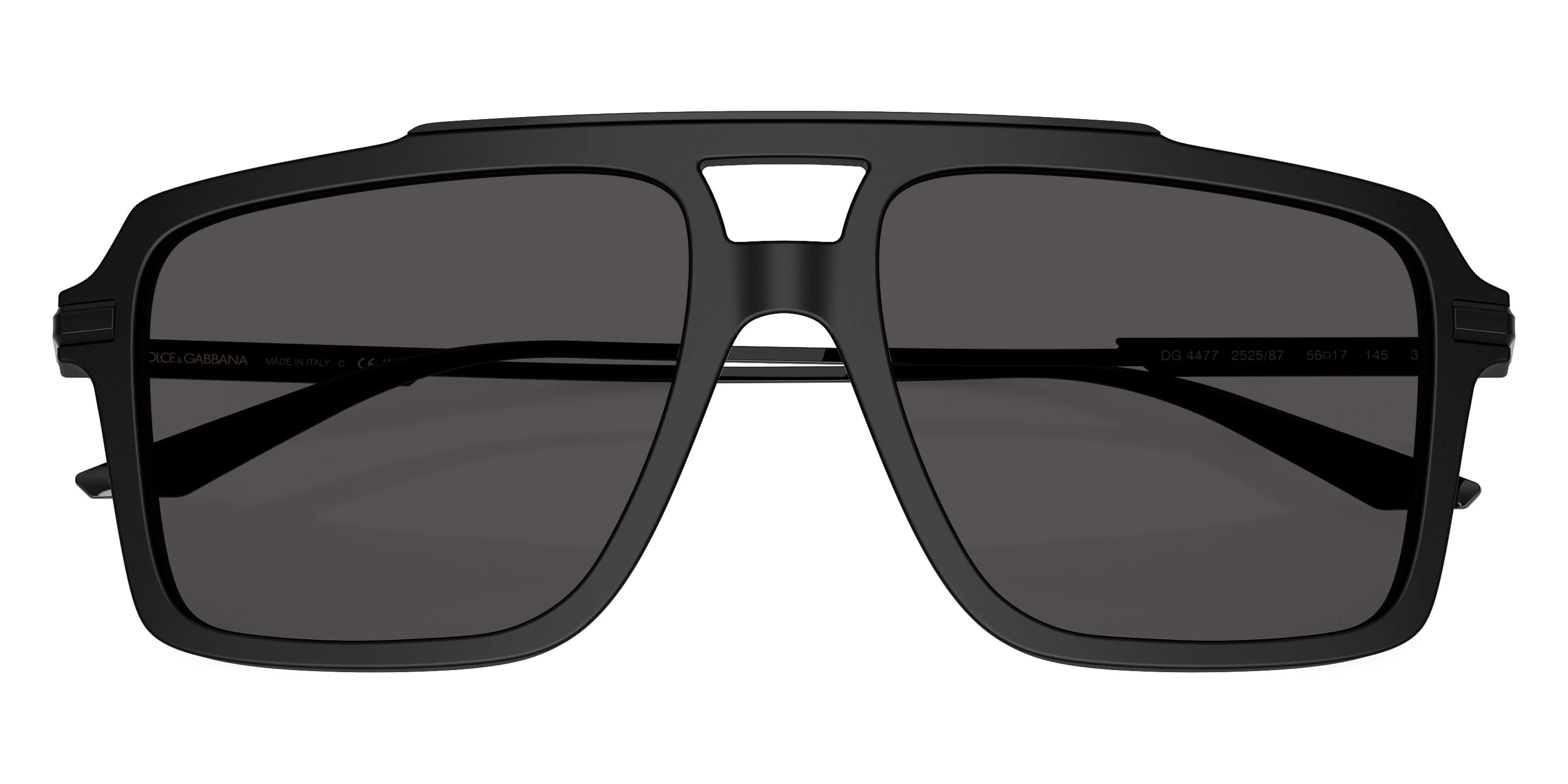 Matte Black/Black (252587) Sunglasses with Dark Gray lenses (DG4477 252587 56) by DOLCE & GABBANA™. Size: 56-17-145, Shape: Aviator, Material: Acetate and Metal.