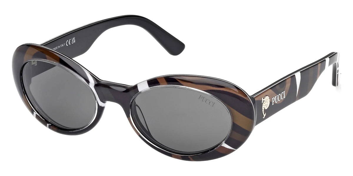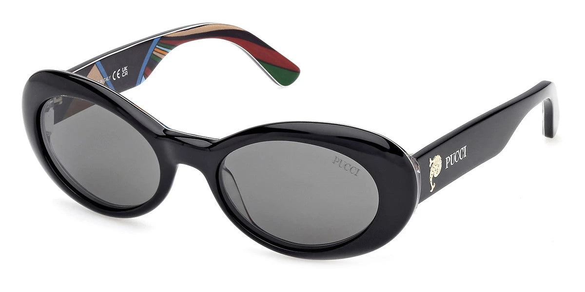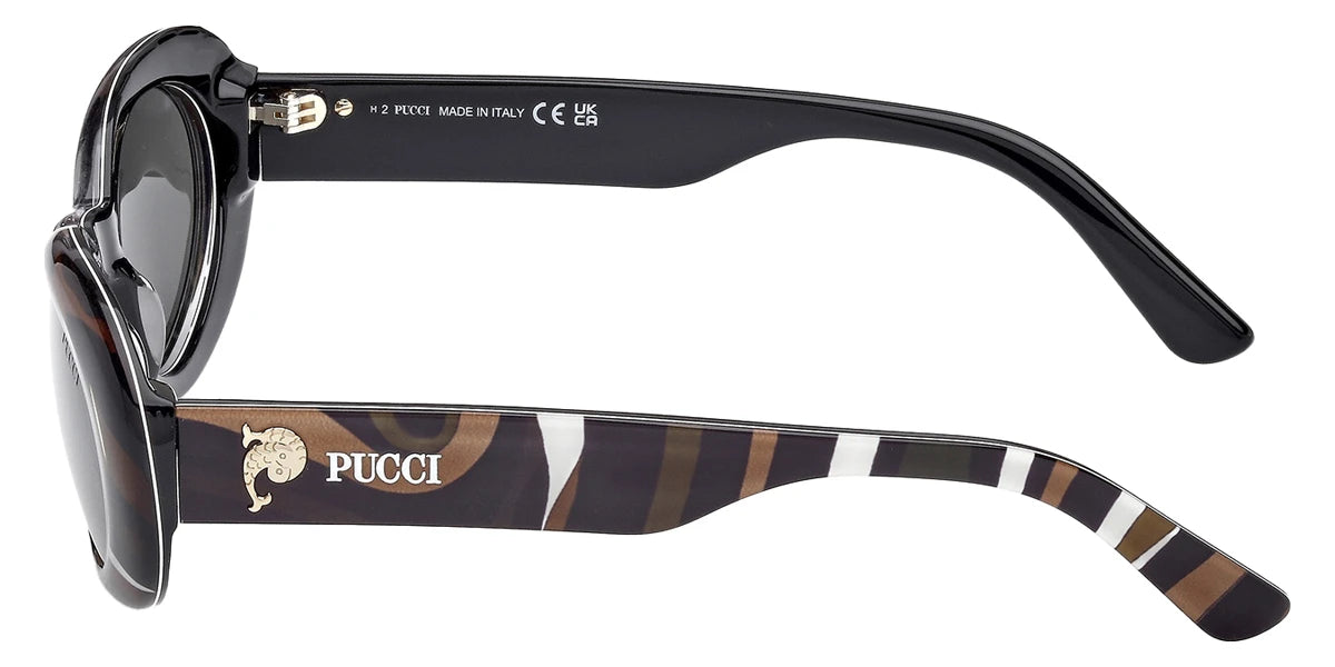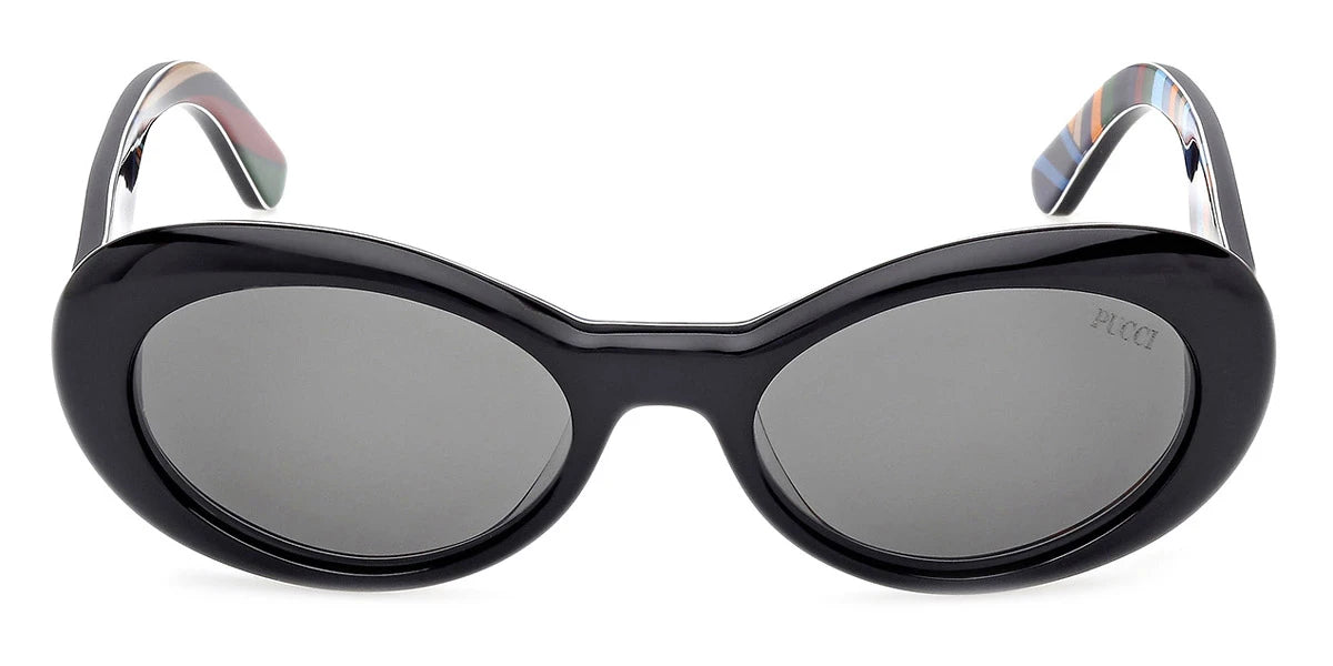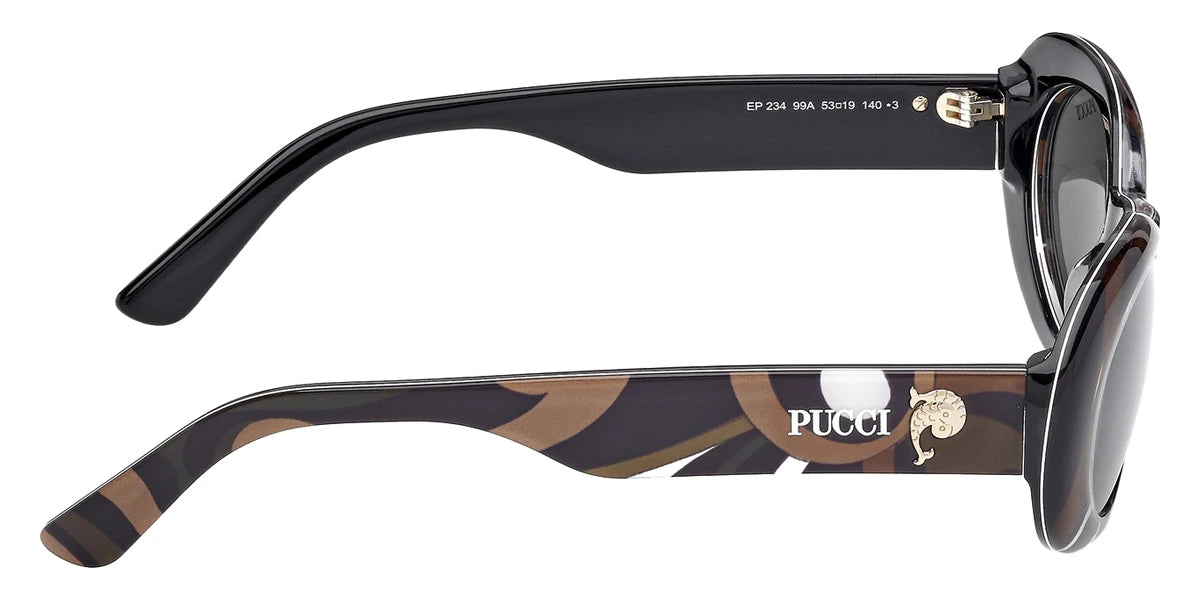 Black/Texture (05A) Sunglasses with Smoke lenses (EP0234 05A 53) by Emilio Pucci™. Size: 53-19-140, Shape: Oval, Material: Plastic.