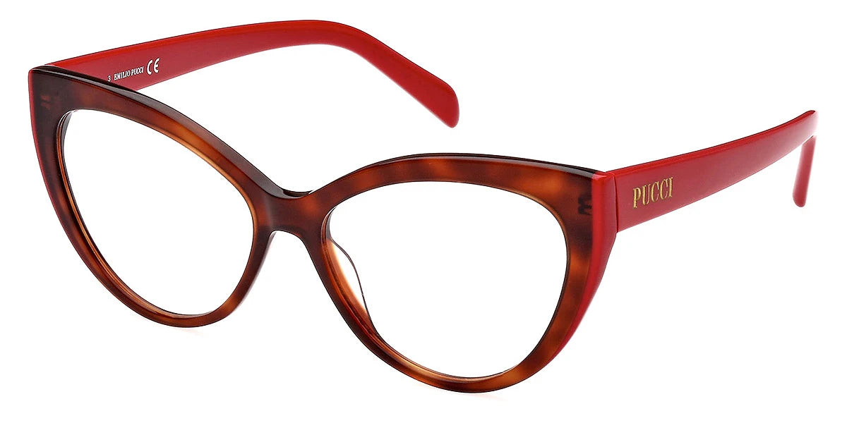 EP5215 Eyeglasses by Emilio Pucci™. The cat-eye shape design feature a full rim plastic frame. This model is available in three different color combinations and sizes. The latest collection of Emilio Pucci eyeglasses is all about the brand’s iconic prints and beautiful colors, revisited with a contemporary flair to create a modern and stylish eyewear, while staying true to the refined elegance associated with the brand. Thanks to a perfect combination of top-grade acetates, the eyewear looks innovative and unique with its fine interplays of geometric elements. For a contemporary and ironic look, Emilio Pucci offers eyeglasses in delicate metal shapes that come decorated with contrasting profiles and vivid touches of color.