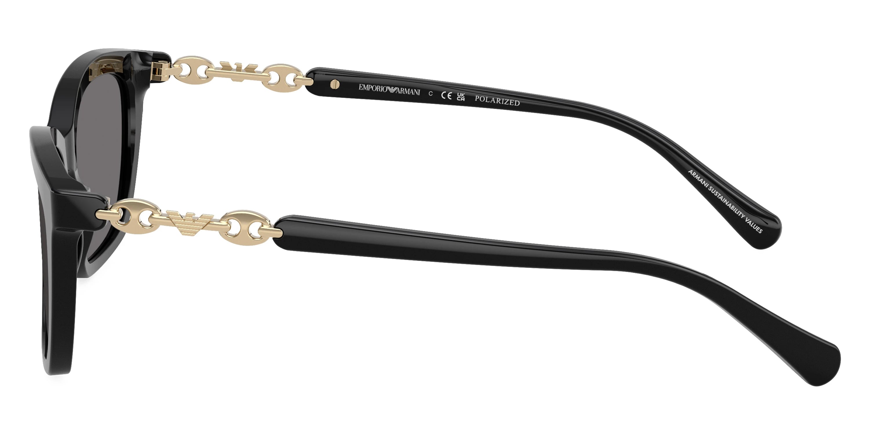 Shiny Black/Shiny Pale Gold (501781) Sunglasses with Dark Gray Polarized lenses (EA4238 501781 54) by EMPORIO ARMANI™. Size: 54-18-140, Shape: Cat-Eye, Material: Acetate and Metal.