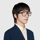 GG1044O Eyeglasses by Gucci™. The aviator shape design feature a full rim acetate frame. This model is available in two different color combinations and sizes. Gucci is a luxury Italian brand that started as a luggage manufacturer, but over time, it developed and grew up into a great fashion house that offers outstanding clothes, shoes, bags, textiles, cosmetics, fragrances, and accessories, including a stunning eyewear collection. Each pair of glasses evokes luxury and symbolizes uniqueness, combined with impeccable design and high-quality materials. Originality, stand-out look, and reliability are the main characteristics of eyewear made by a trustworthy and would-known brand that has got the reputation of the leader in a wonderful world of modern vogue and bold design.