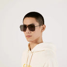 GG1099SA Sunglasses by Gucci™. The aviator shape design feature a full rim metal frame. This model is available in four different color combinations and sizes. Gucci is a luxury Italian brand that started as a luggage manufacturer, but over time, it developed and grew up into a great fashion house that offers outstanding clothes, shoes, bags, textiles, cosmetics, fragrances, and accessories, including a stunning eyewear collection. Each pair of glasses evokes luxury and symbolizes uniqueness, combined with impeccable design and high-quality materials. Originality, stand-out look, and reliability are the main characteristics of eyewear made by a trustworthy and would-known brand that has got the reputation of the leader in a wonderful world of modern vogue and bold design.