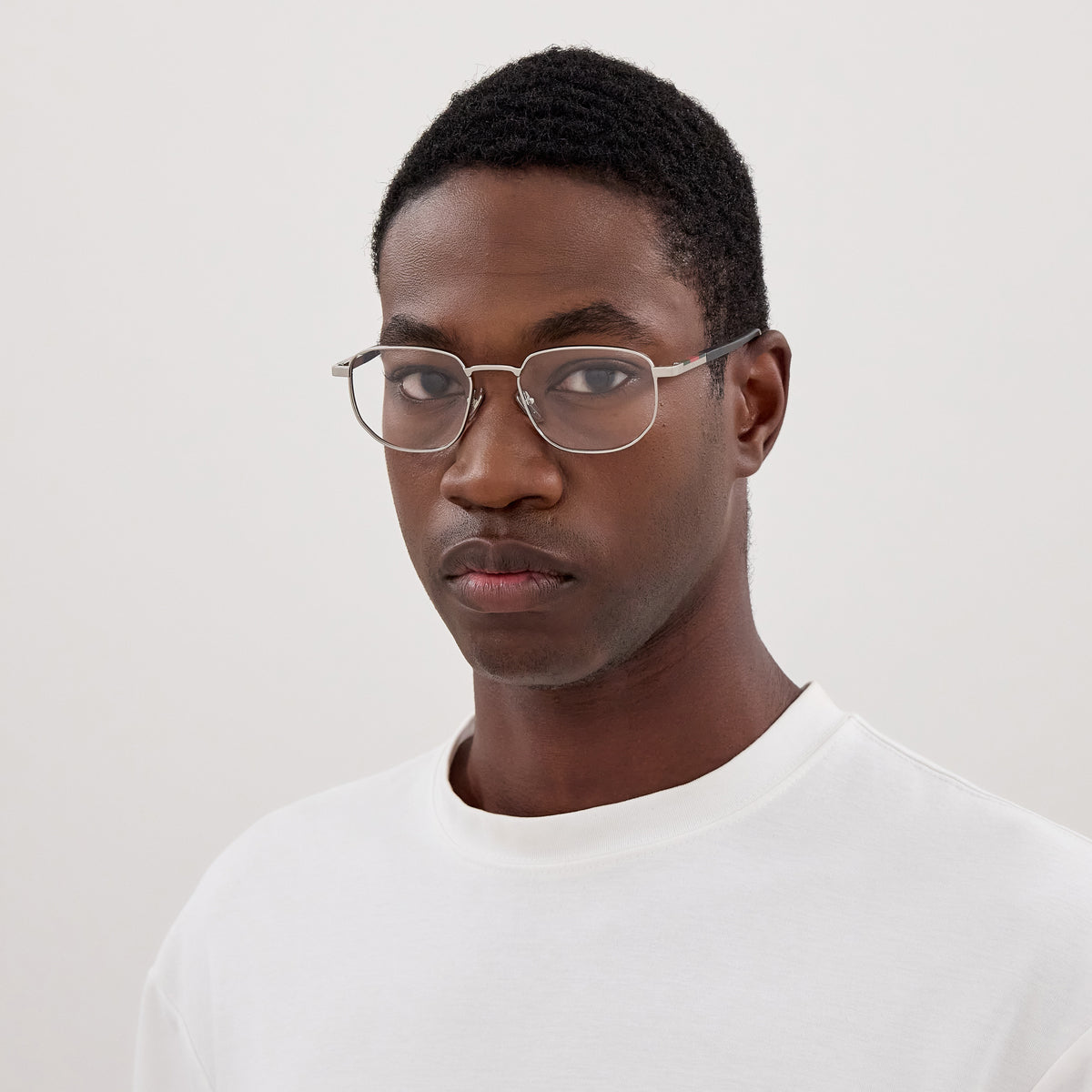 Silver/Black (001) Eyeglasses (GG2093O 001 53) by Gucci. Size: 53-19-145, Shape: Rectangle, Material: Metal and Rubber.