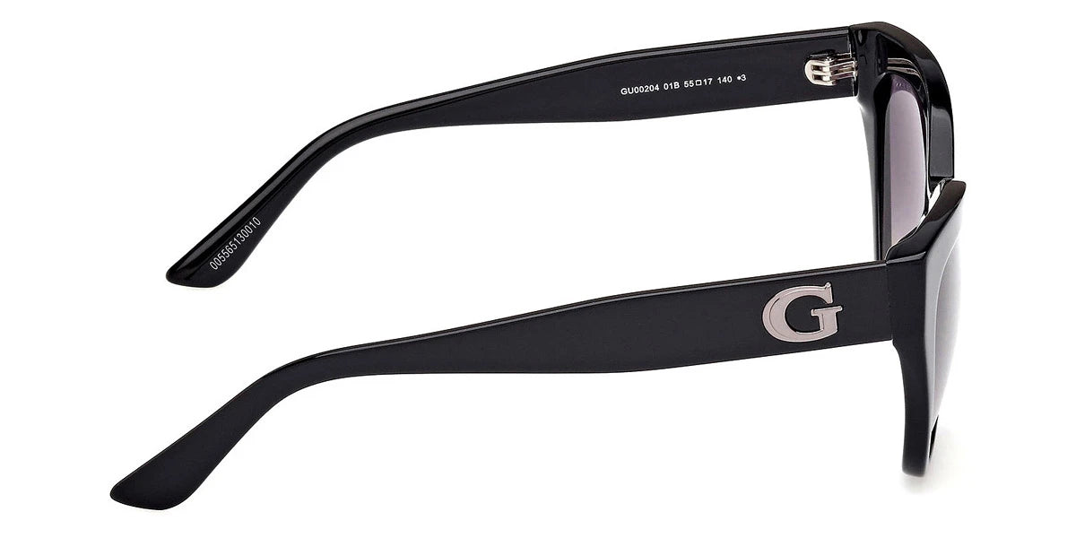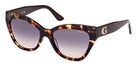 Dark Havana/Shiny Dark Brown (52B) Sunglasses with Gradient Smoke lenses (GU00204 52B 55) by Guess™. Size: 55-17-140, Shape: Cat-Eye, Material: Plastic.