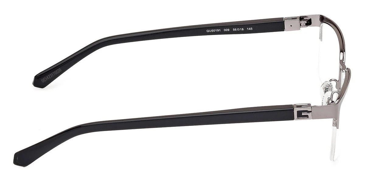 Matte Gunmetal/Shiny Black (009) Eyeglasses (GU50191 009 56) by Guess™. Size: 56-18-145, Shape: Rectangle, Material: Metal.