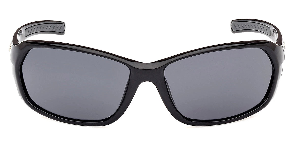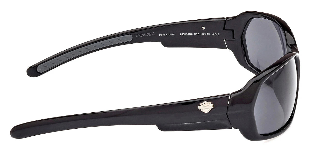 Shiny Black (01A) Sunglasses with Smoke lenses (HD0913X 01A 63) by Harley-Davidson™. Size: 63-16-125, Shape: Rectangle, Material: Plastic.