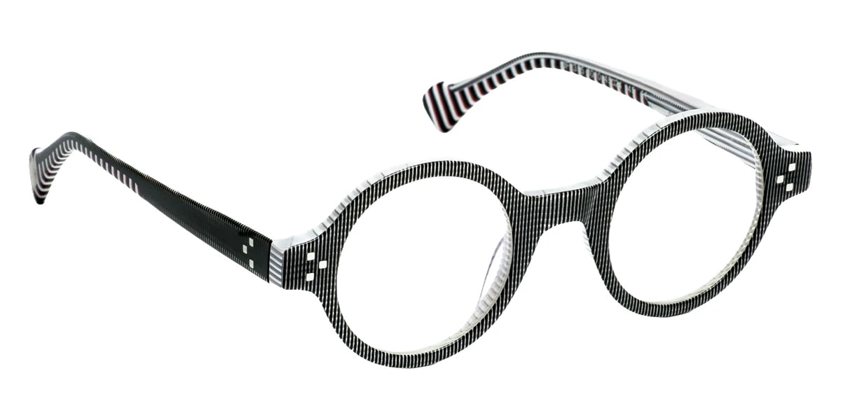 Black Pixel/Striped Burgundy (0010) Eyeglasses (JF1355 0010 45) by J.F. Rey™. Size: 45-24-145, Shape: Round, Material: Acetate.