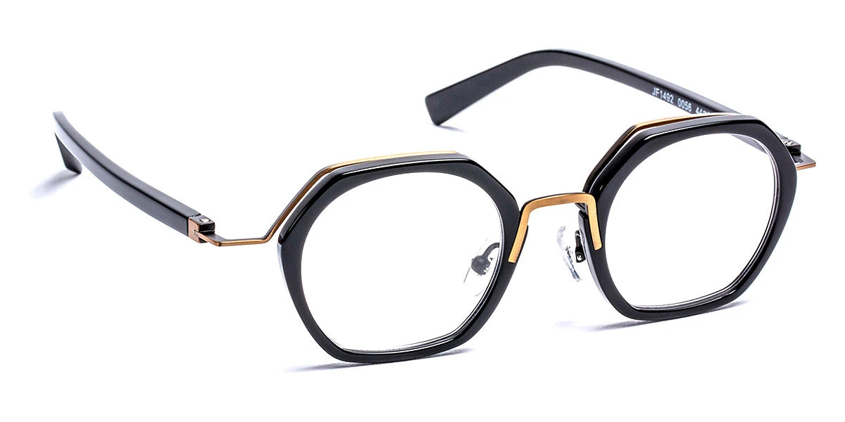 Shiny Black/Brushed Gold (0056) Eyeglasses (JF1492 0056 44) by J.F. Rey™. Size: 44-21-141, Shape: Geometric, Material: Acetate and Metal.