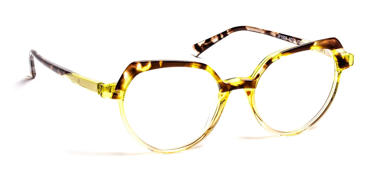 JF1509 Eyeglasses by J.F. Rey™. The cat-eye shape design feature a full rim acetate frame. This model is available in five different color combinations and sizes. Oversized in its shape, this slender acetate frame is carried by a cut-out on its upper side. The alternation of solid and transparent colours and the play on acetate thicknesses modernise the retro-inspired shape, while emphasising it.
