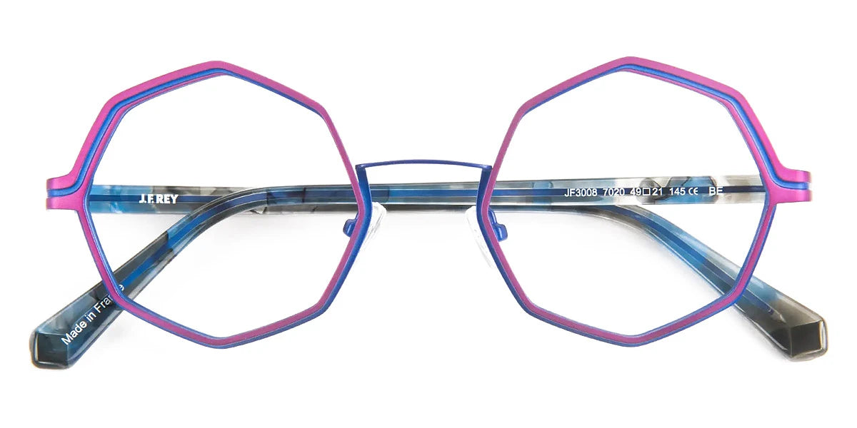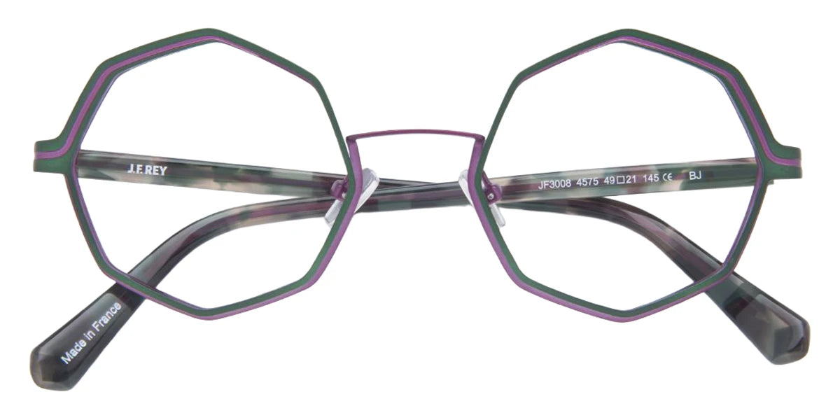 JF3008 Eyeglasses by J.F. Rey™. The geometric shape design feature a full rim metal frame. This model is available in four different color combinations and sizes. With its strong geometric line, oversized shape and dynamic colours, this women's frame reveals a real strength of character. Attention is paid to details, and the fluidity of the engraved line on the face emphasises the shape by lightening it while allowing for a subtle two-tone effect on two levels.