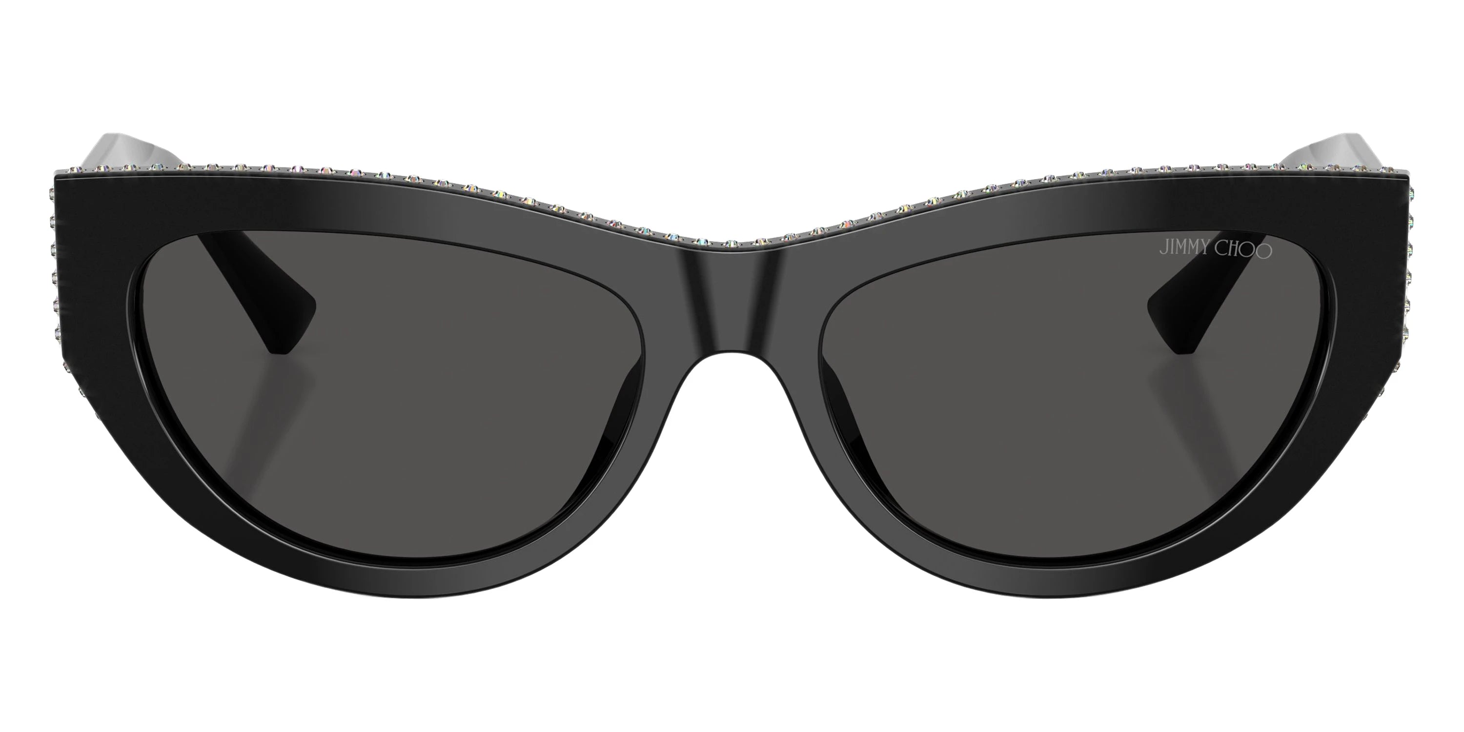 Black (50006G) Sunglasses with Gray Mirrored Black lenses (JC5034BU 50006G 54) by Jimmy Choo™. Size: 54-17-140, Shape: Cat-Eye, Material: Acetate.