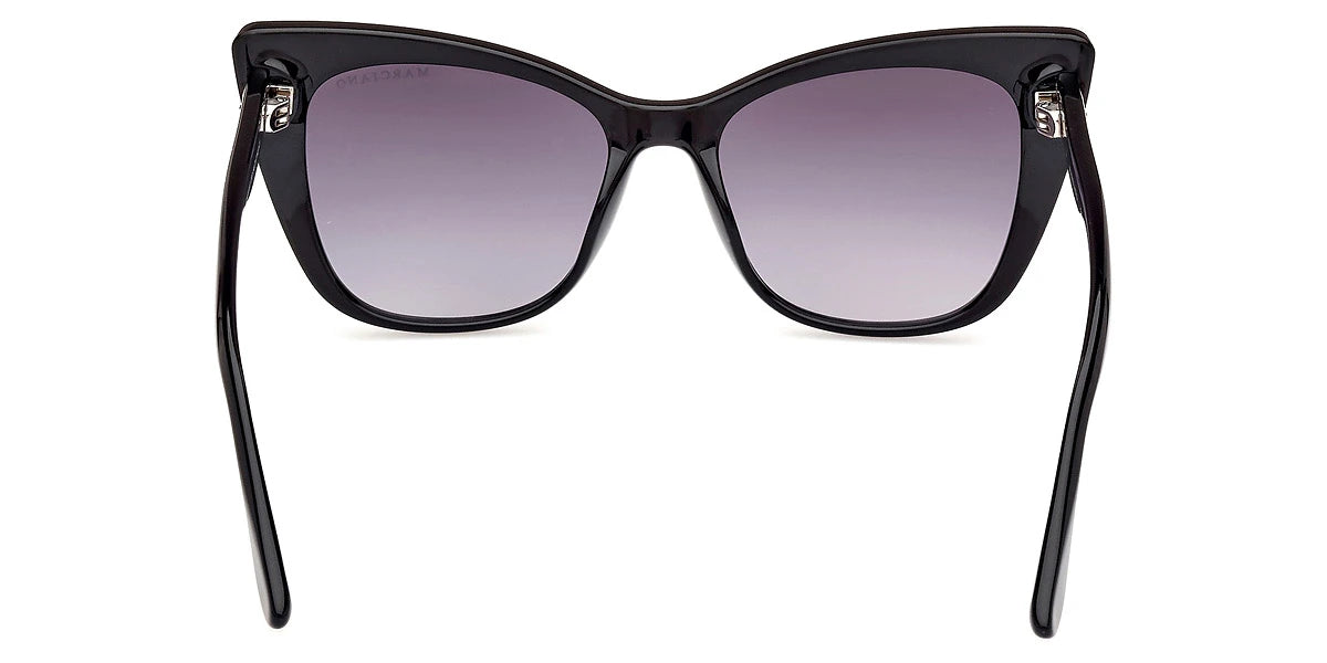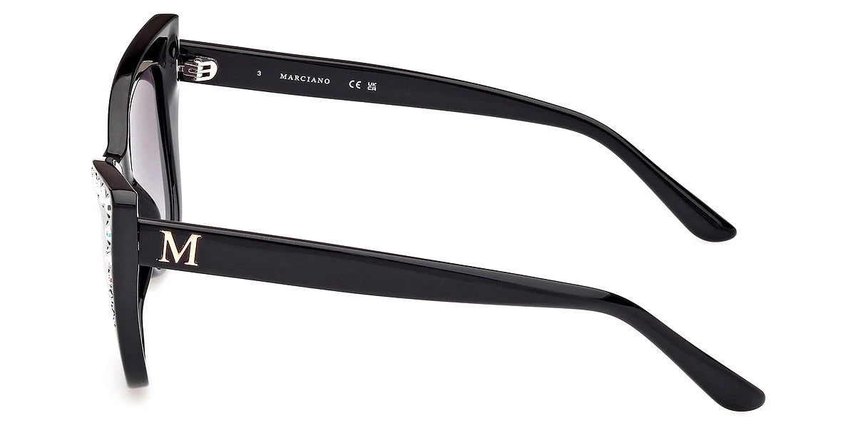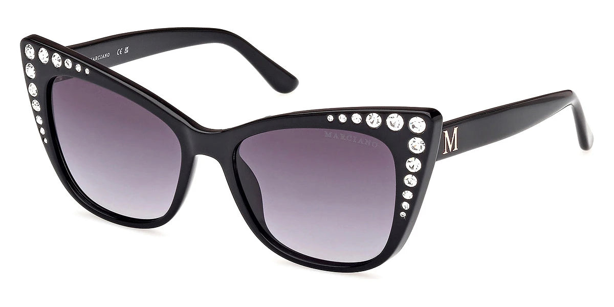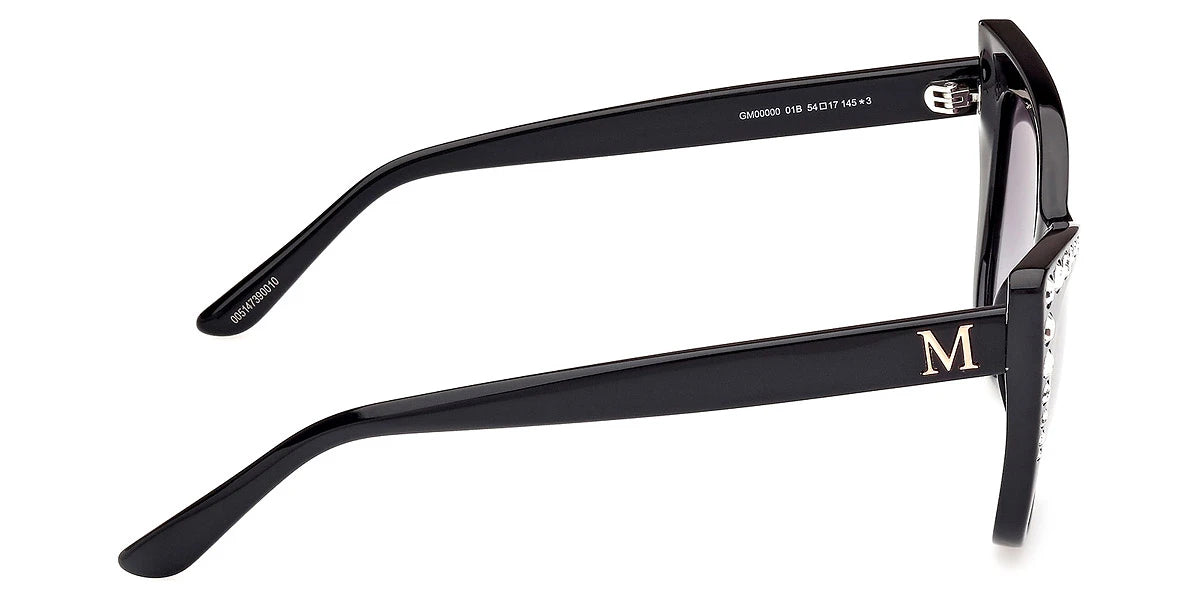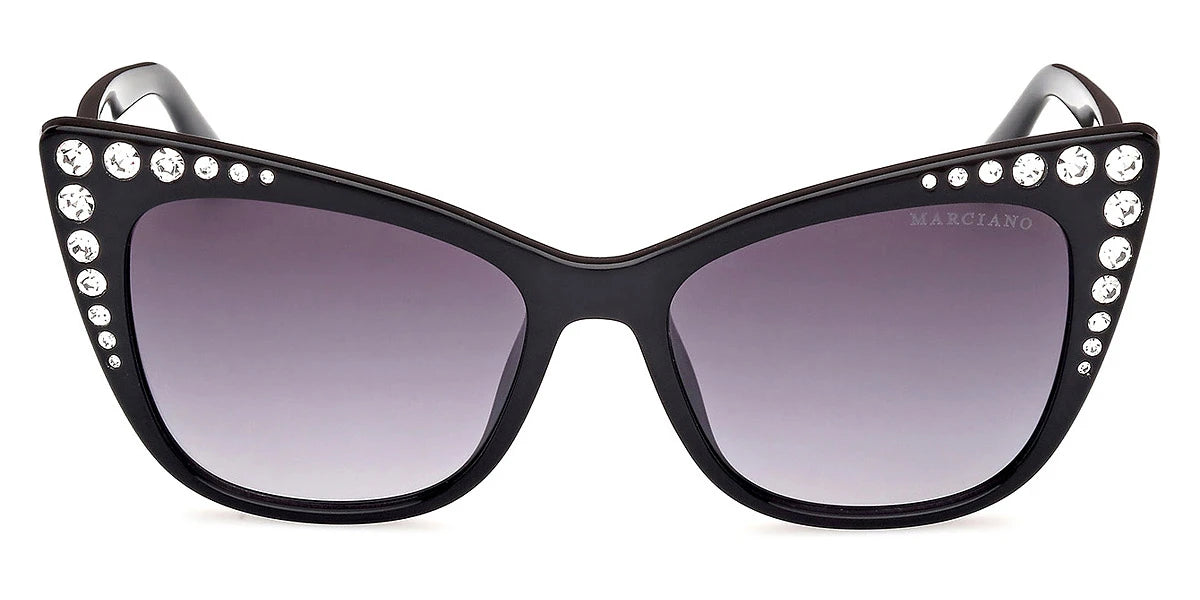 Shiny Black (01B) Sunglasses with Gradient Smoke lenses (GM00000 01B 54) by Marciano™. Size: 54-17-145, Shape: Cat-Eye, Material: Injected.