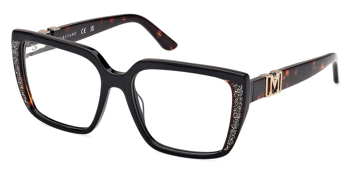 Shiny Black (005) Eyeglasses (GM50013 005 55) by Marciano™. Size: 55-16-140, Shape: Square, Material: Plastic.