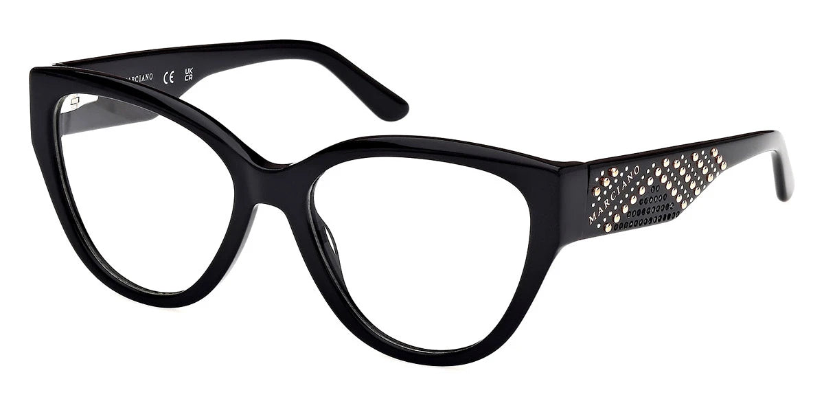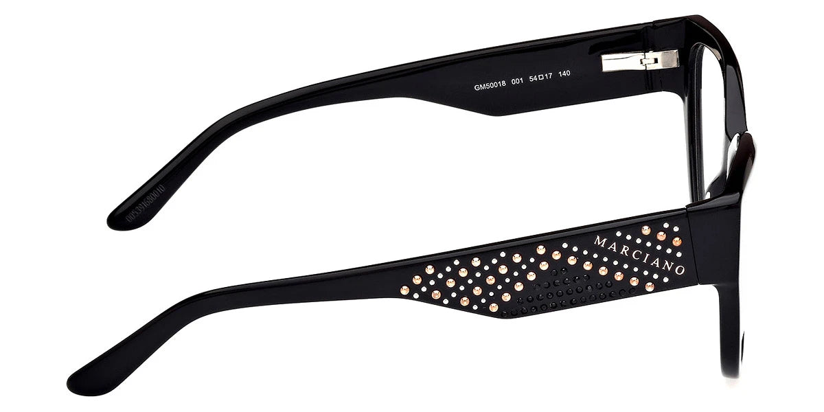 Shiny Black (001) Eyeglasses (GM50018 001 54) by Marciano™. Size: 54-17-140, Shape: Cat-Eye, Material: Plastic.