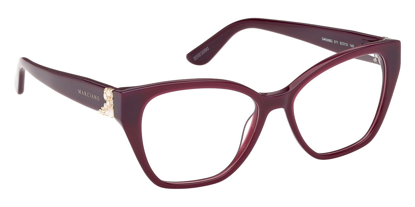 Shiny Bordeaux (071) Eyeglasses (GM50063 071 50) by Marciano. Size: 50-15-140, Shape: Cat-Eye, Material: Plastic.