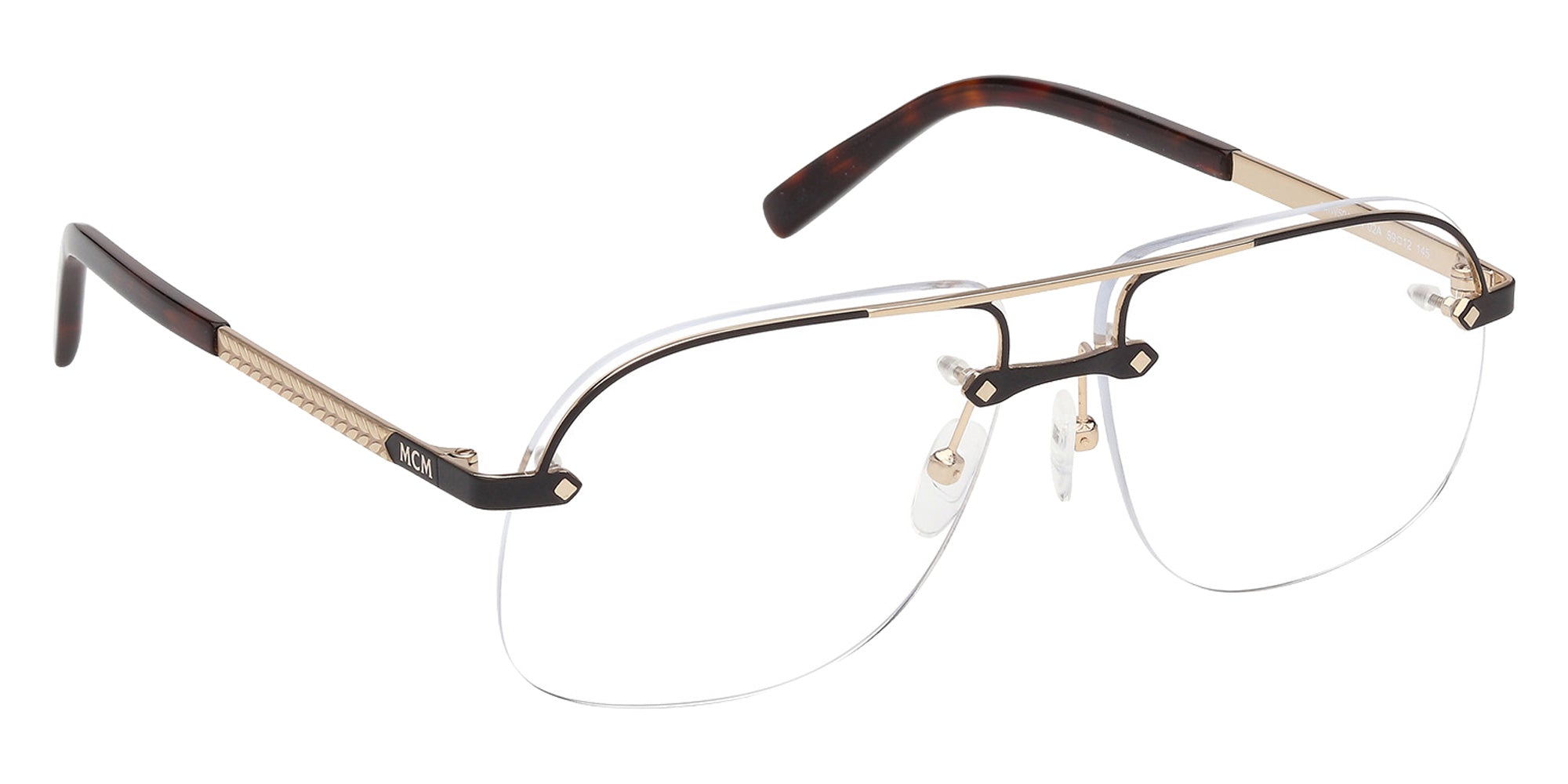The aviator shape design feature a semi rimless metal frame. This model is available in two different color combinations and sizes. The worldwide renowned MCM brand presents a new collection of eyeglasses that combines a modern and fresh design with timeless luxury. Appealing to the nomad generation – creative and motivated young people who appreciate both functionality and glamour, MCM frames combine exceptional craftsmanship and contemporary design. The timeless silhouettes are embellishes with captivating prints and temple logo plaques for an incredibly chic finish.