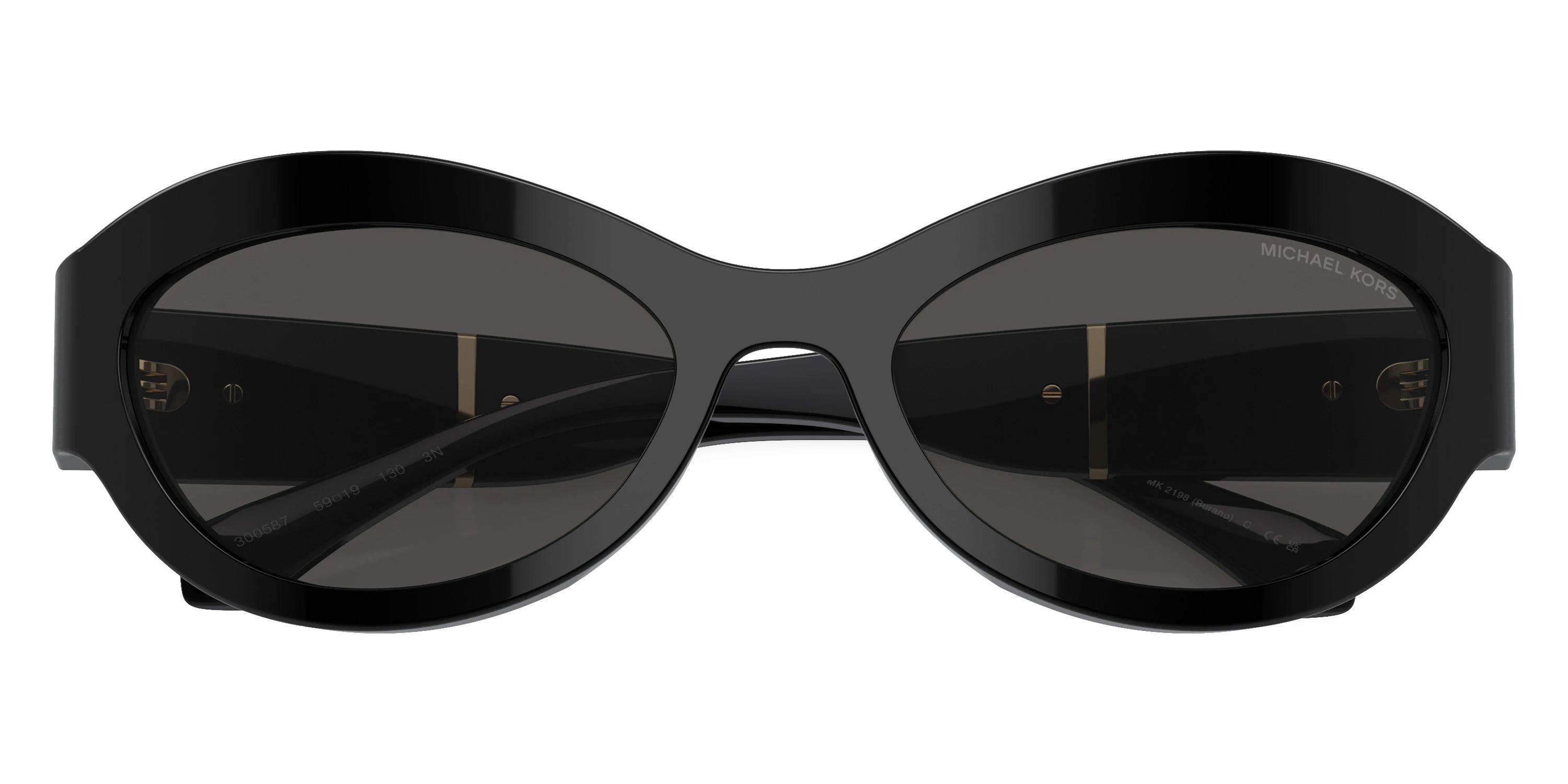 Black (300587) Sunglasses with Dark Gray Solid lenses (Burano MK2198 300587 59) by MICHAEL KORS™. Size: 59-19-130, Shape: Oval, Material: Acetate.