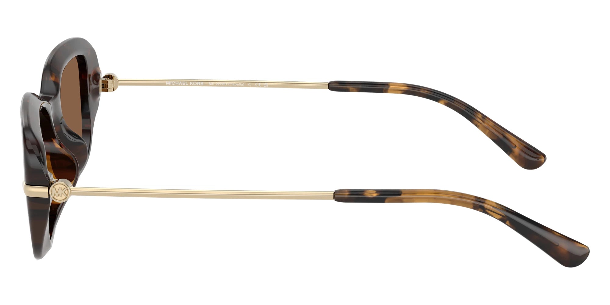 Light Gold/Dark Tortoise (30063G) Sunglasses with Dark Brown Solid lenses (Capella MK2228D 30063G 57) by MICHAEL KORS™. Size: 57-16-145, Shape: Rectangle, Material: Injected and Metal.