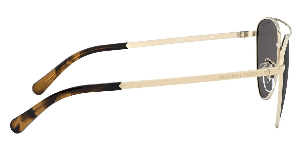 Light Gold (101487) Sunglasses with Dark Gray Solid lenses (MK1056 101487 58) by MICHAEL KORS™. Size: 58-15-140, Shape: Aviator, Material: Metal.