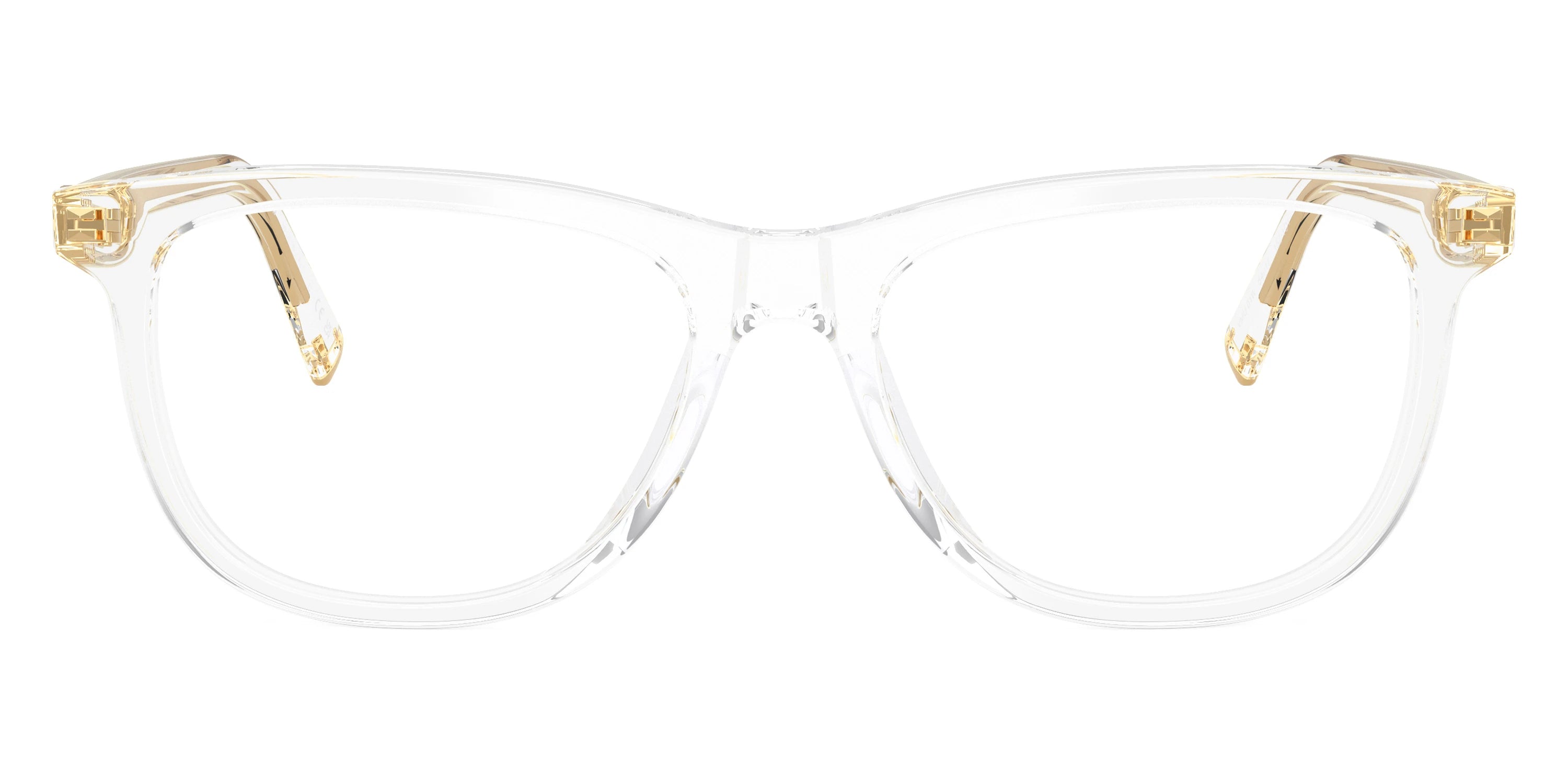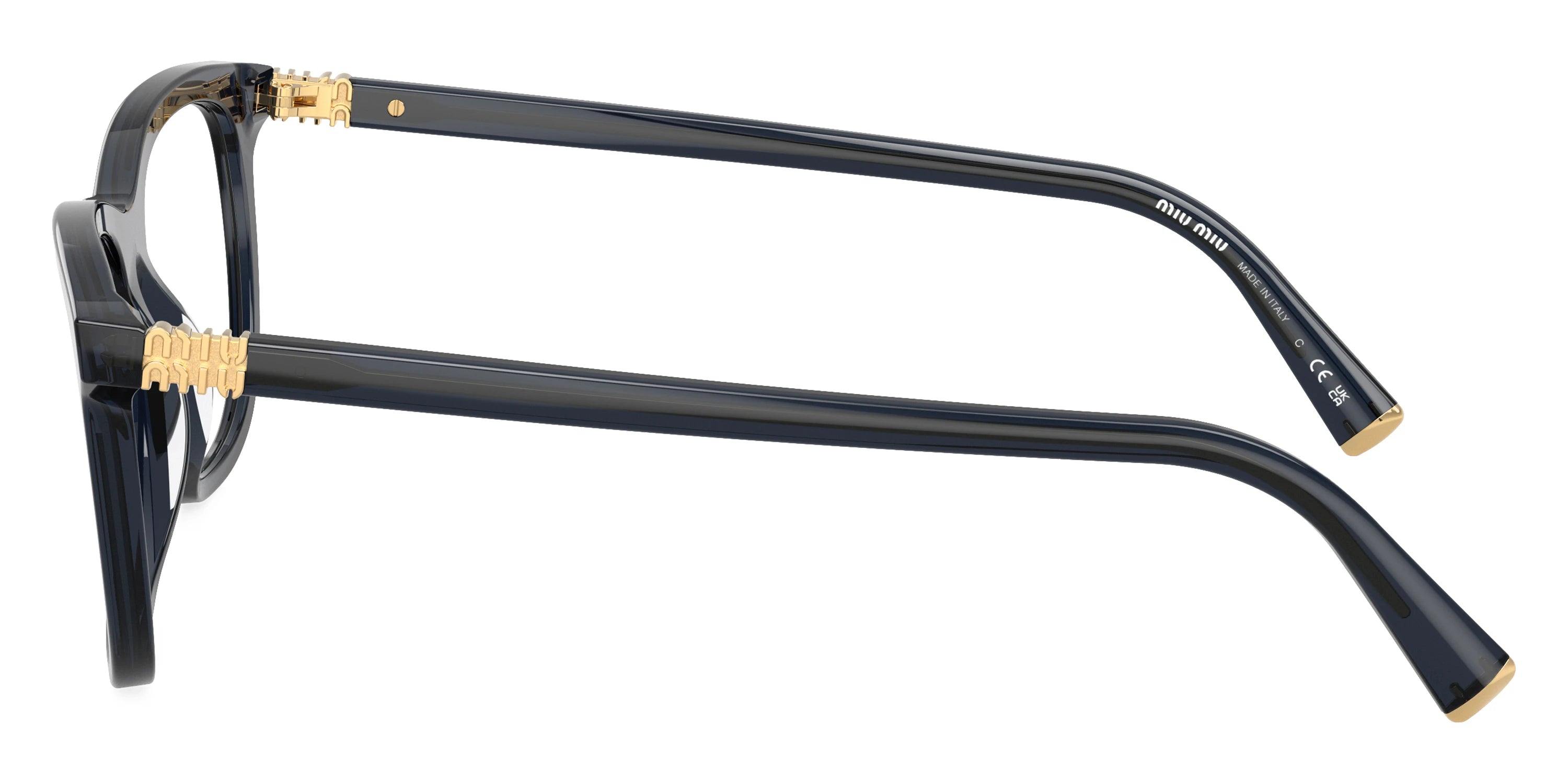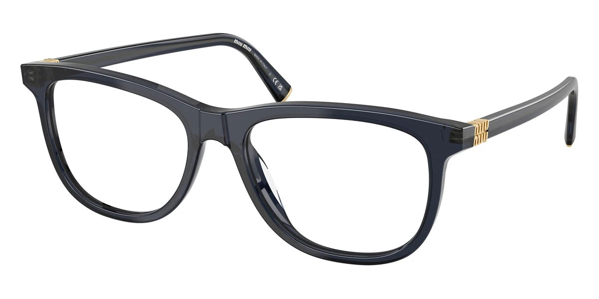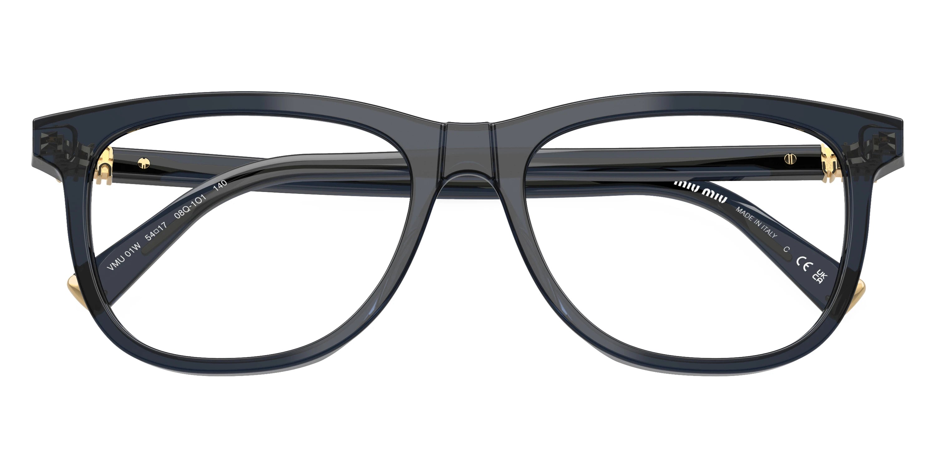 Blue Transparent (08Q1O1) Eyeglasses (MU 01WV 08Q1O1 52) by Miu Miu. Size: 52-17-140, Shape: Wayfarer, Material: Acetate and Metal.