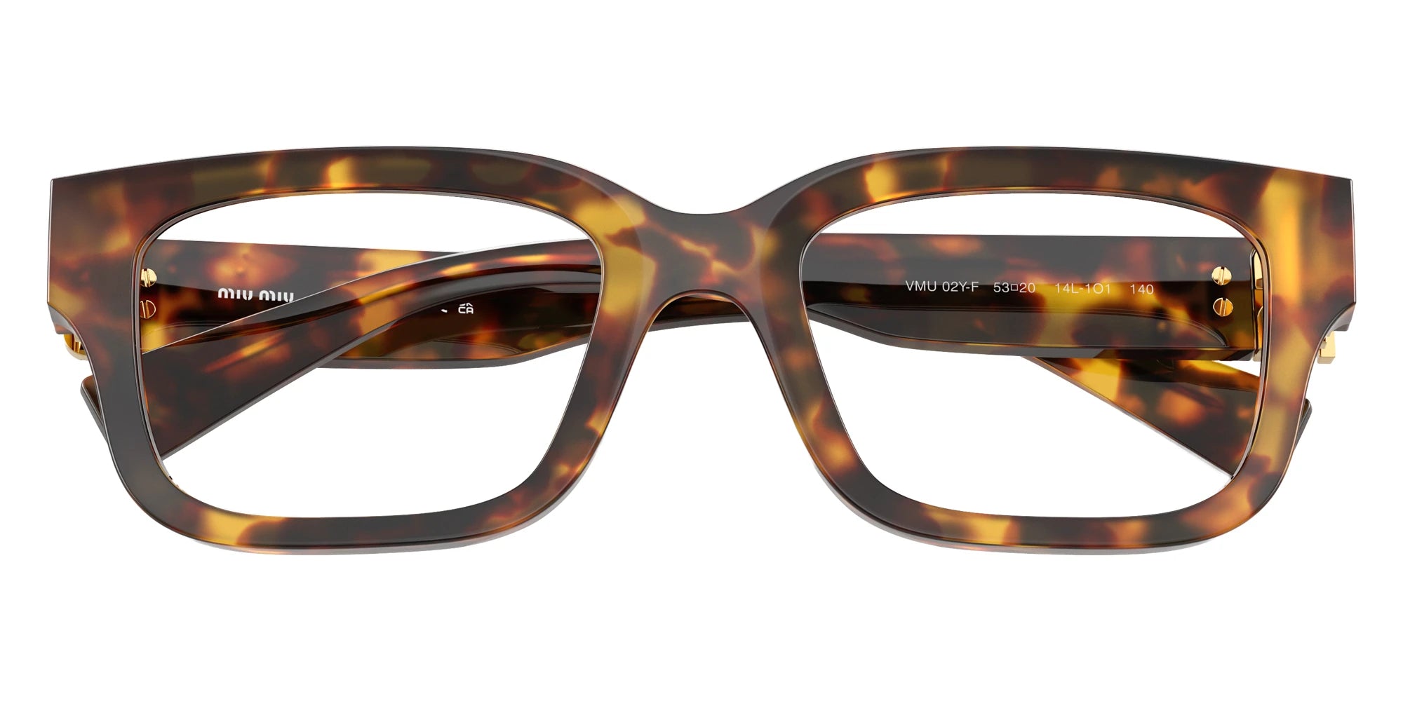 Havana Honey (14L1O1) Eyeglasses (MU 02YVF 14L1O1 54) by Miu Miu. Size: 54-18-140, Shape: Rectangle, Material: Acetate and Metal.