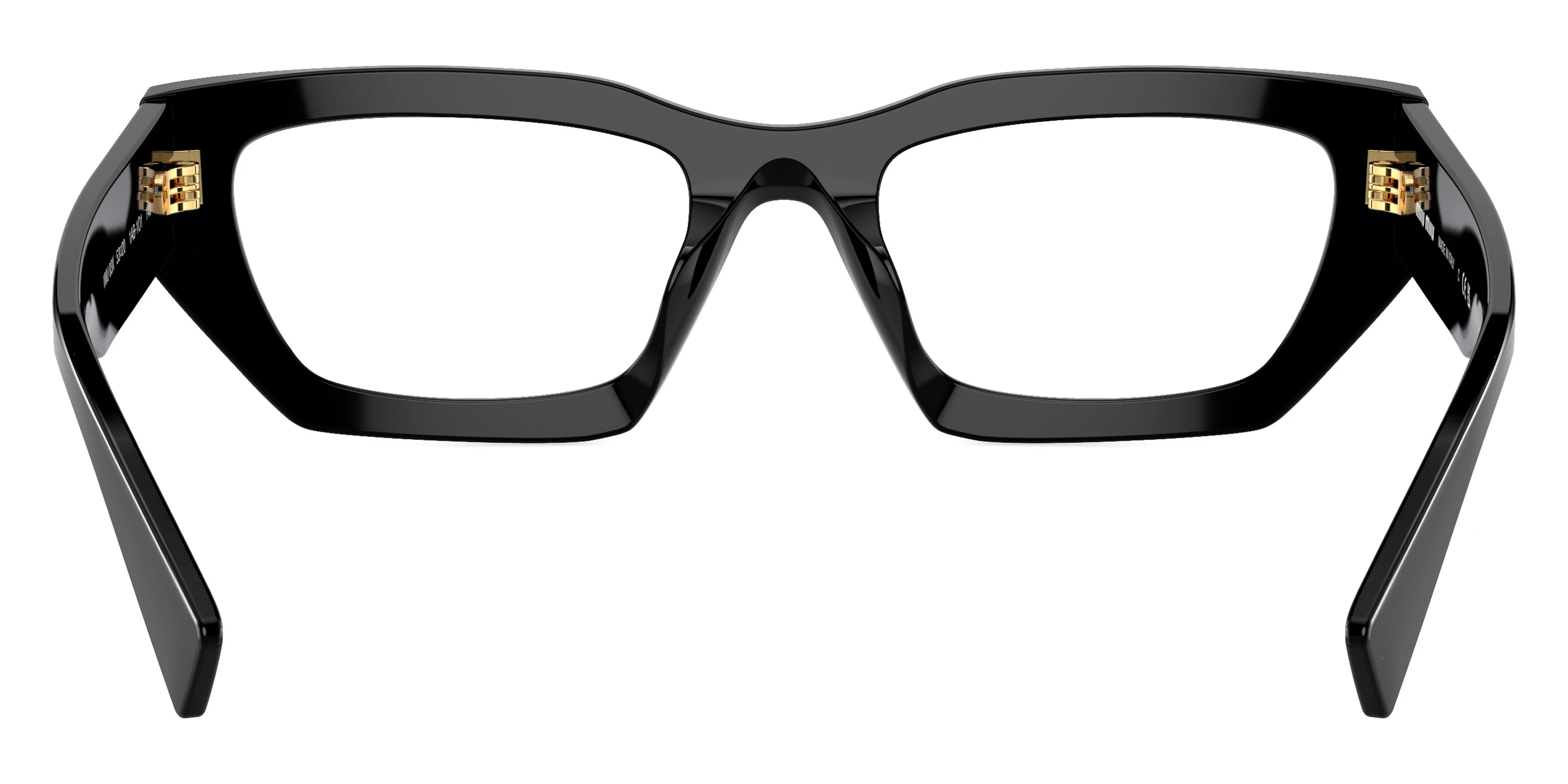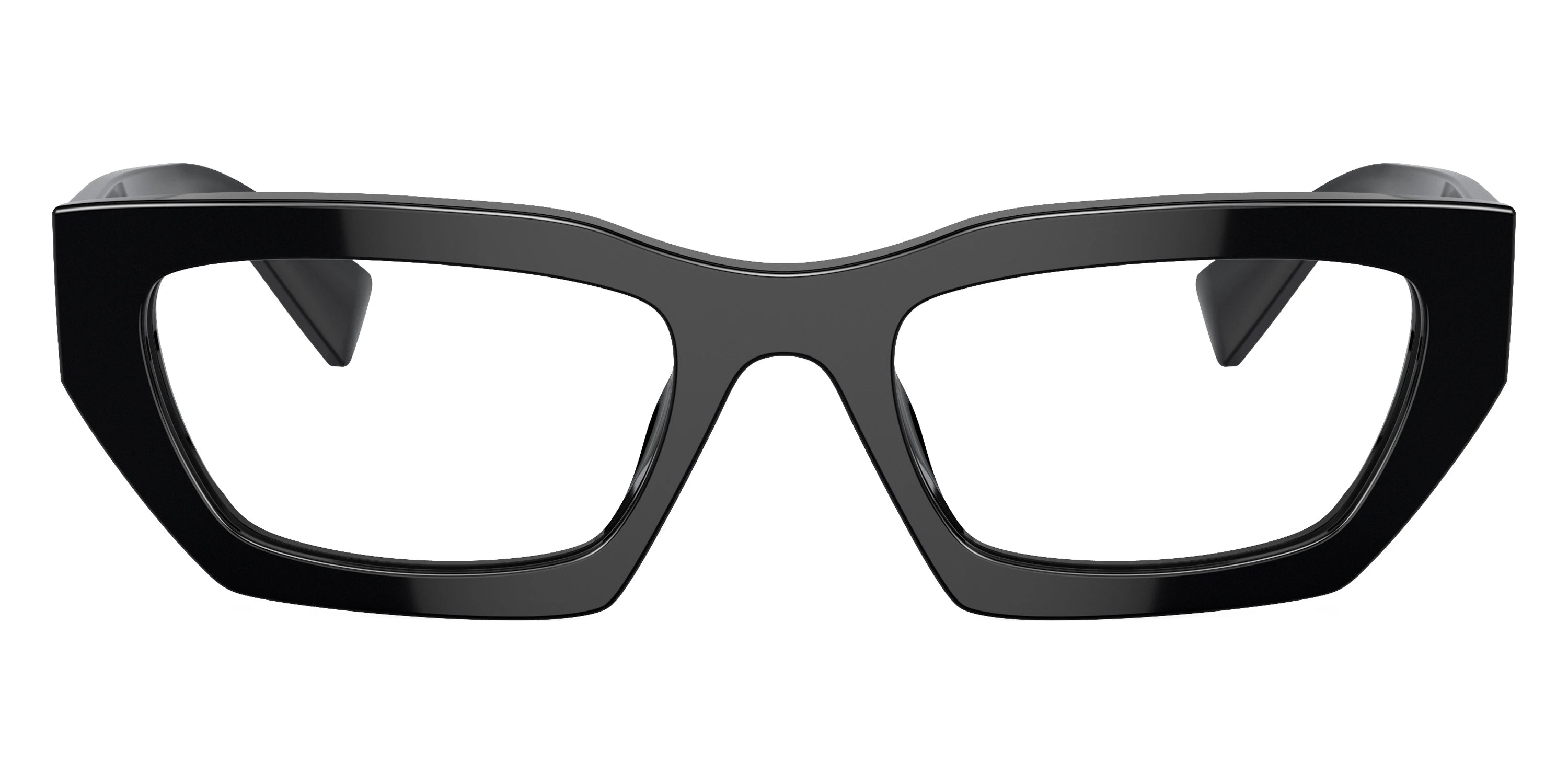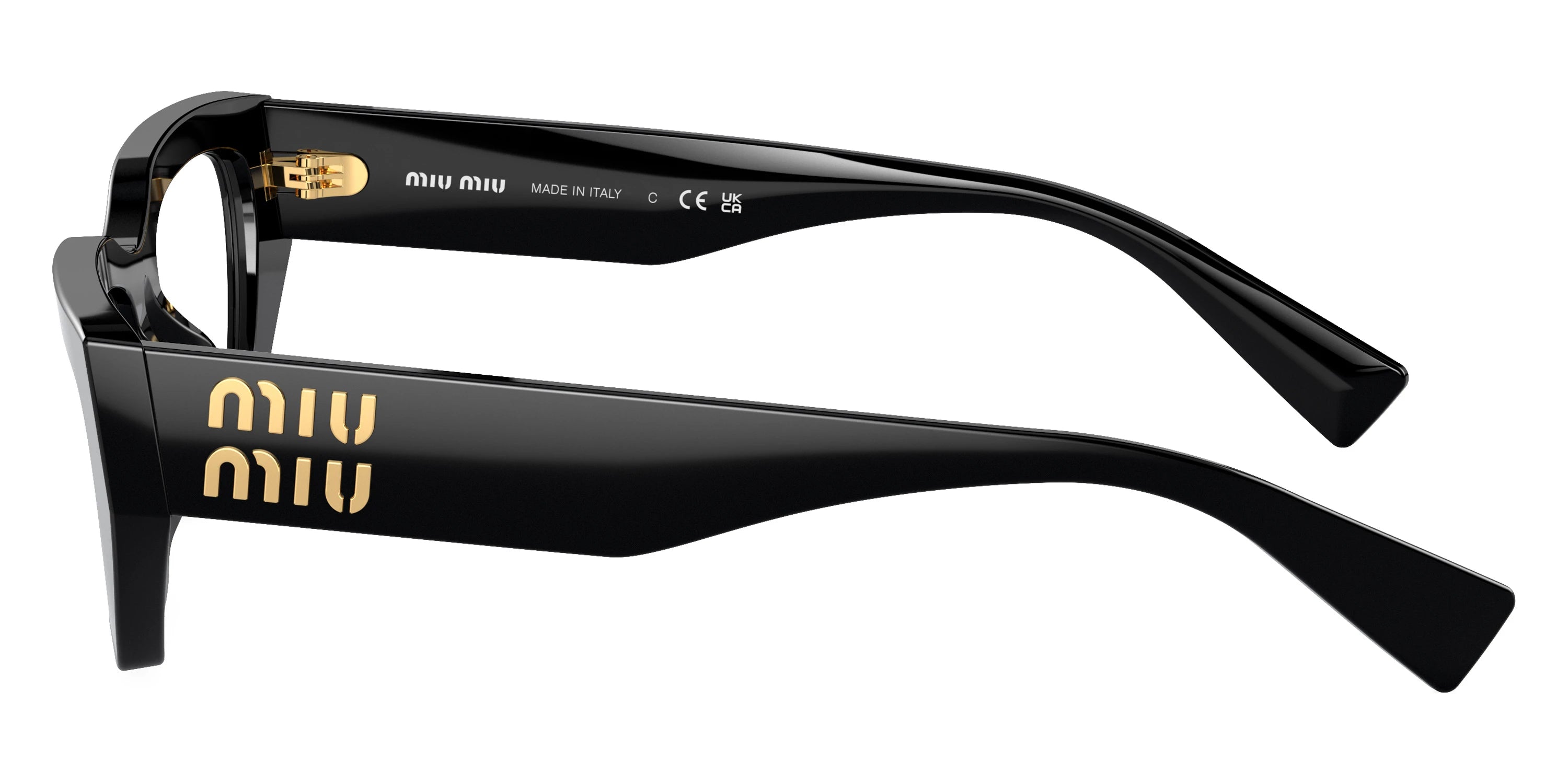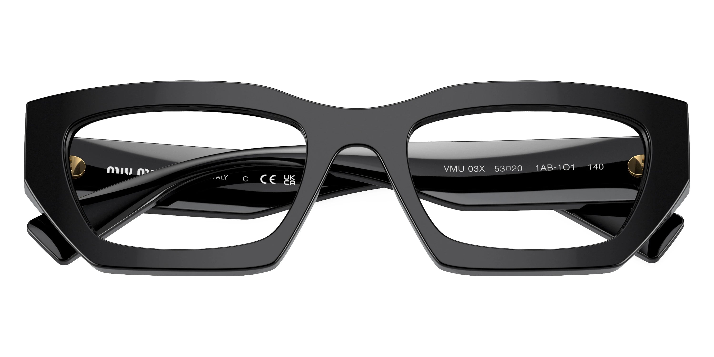 Black (1AB1O1) Eyeglasses (MU 03XV 1AB1O1 53) by Miu Miu. Size: 53-20-140, Shape: Irregular, Material: Acetate.