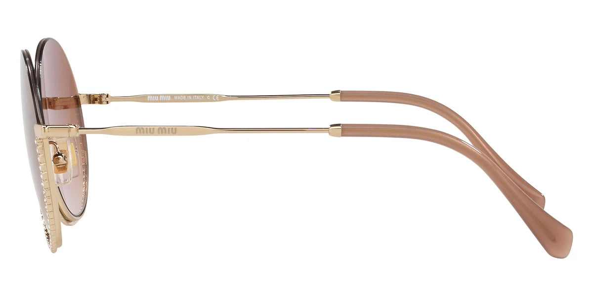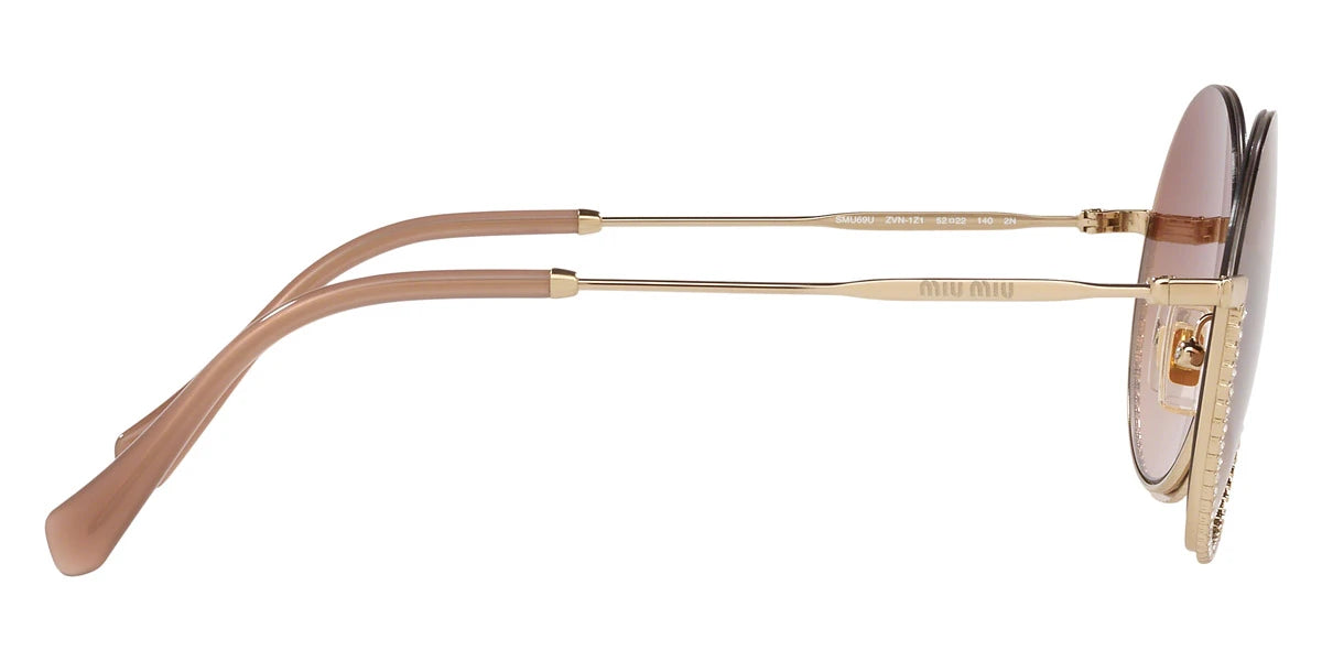 Pale Gold (ZVN1Z1) Sunglasses with Brown Gradient lenses (MU 69US ZVN1Z1 52) by Miu Miu. Size: 52-22-140, Shape: Round, Material: Metal.