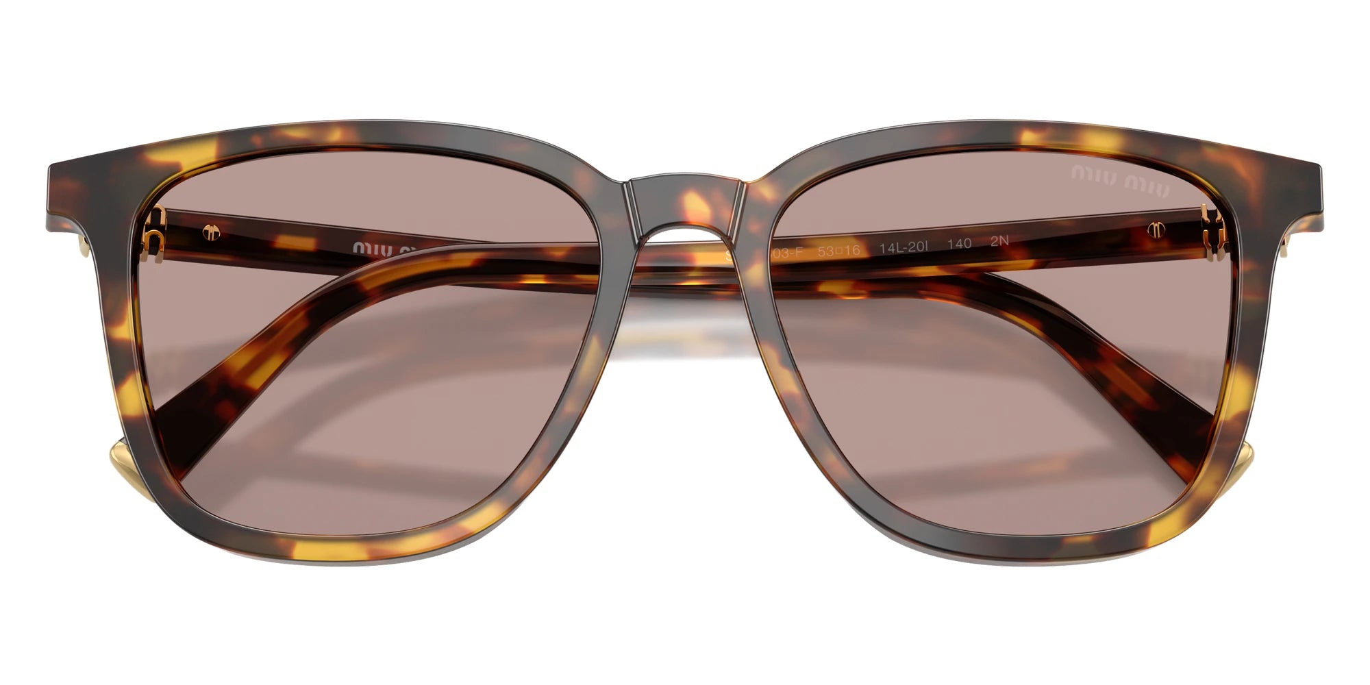 Honey Havana (14L20I) Sunglasses with Light Purple Brown lenses (MU B03SF 14L20I 53) by Miu Miu. Size: 53-16-140, Shape: Square, Material: Acetate and Metal.
