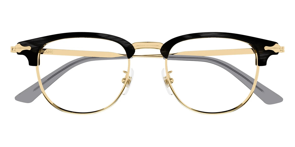 Gray/Gold (003) Eyeglasses (MB0364O 003 49) by Montblanc™. Size: 49-19-150, Shape: Browline, Material: Metal and Recycled Acetate.