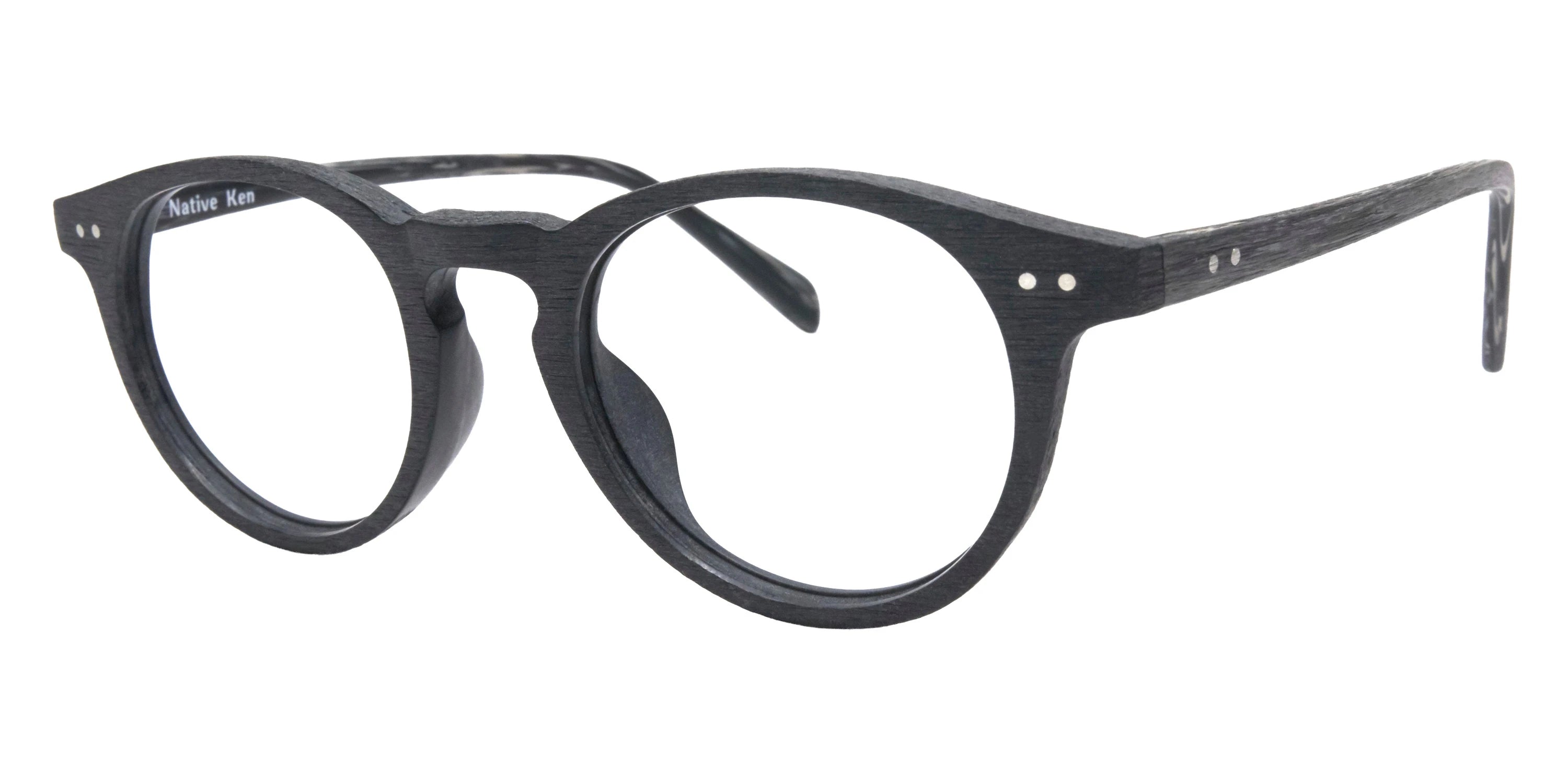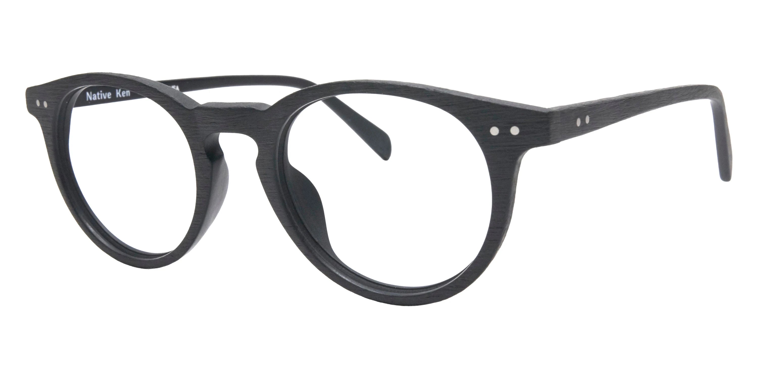 Matte Black/Gray Eyeglasses (Spruce 48) by Native Ken™. Size: 48-21-143, Shape: Round, Material: Acetate.
