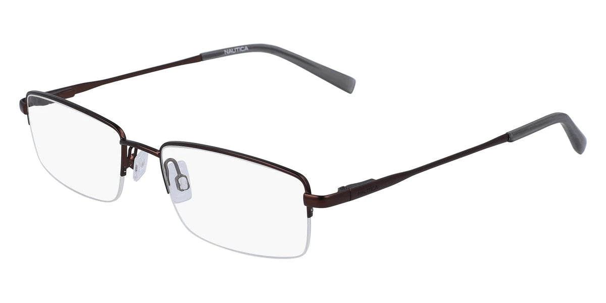 Satin Brown (210) Eyeglasses (N7299 210 53) by Nautica™. Size: 53-18-140, Shape: Rectangle, Material: Metal.