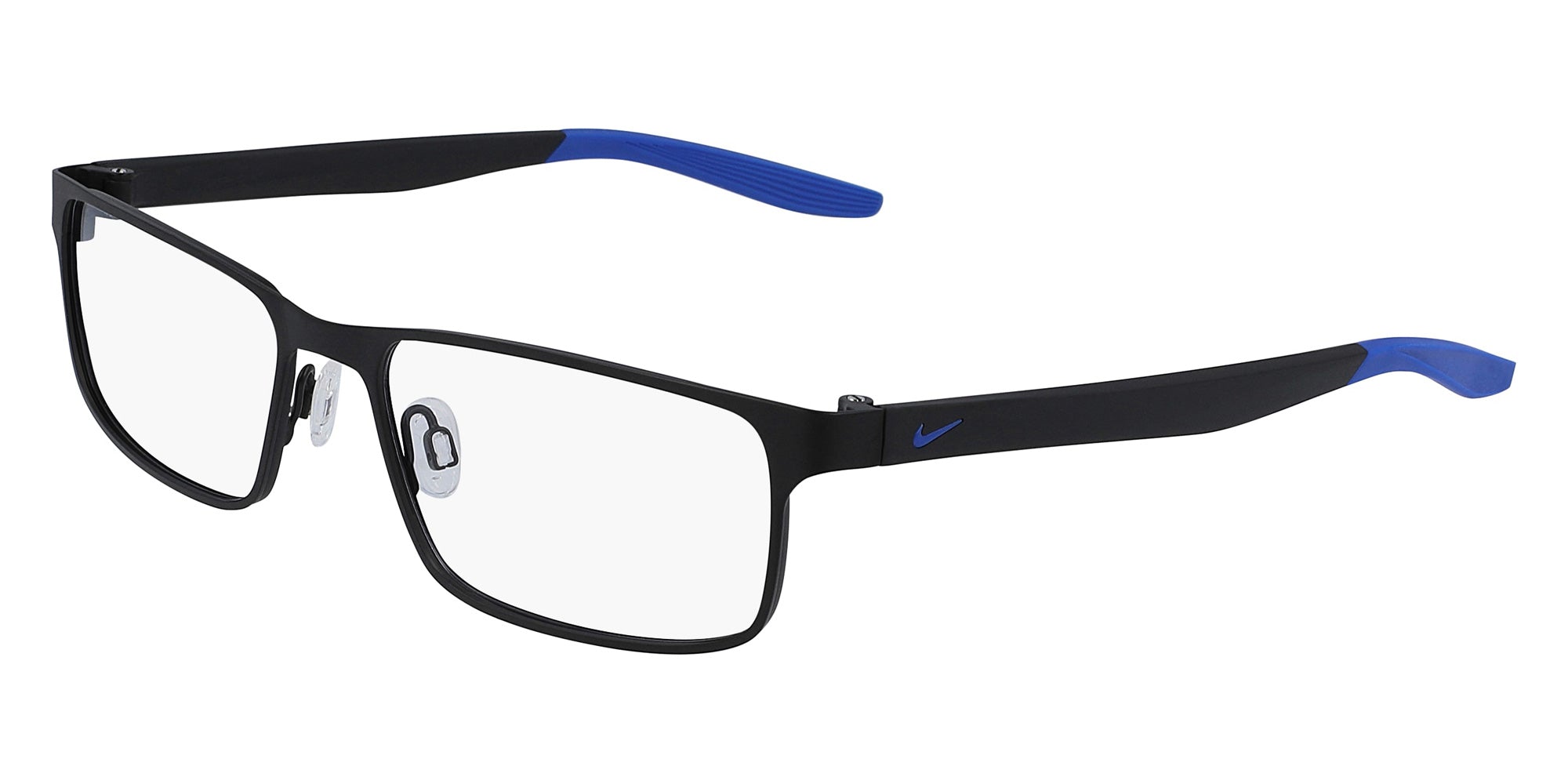 Satin Black/Racer Blue (008) Eyeglasses (8131 008 55) by Nike. Size: 55-17-140, Shape: Rectangle, Material: Metal.