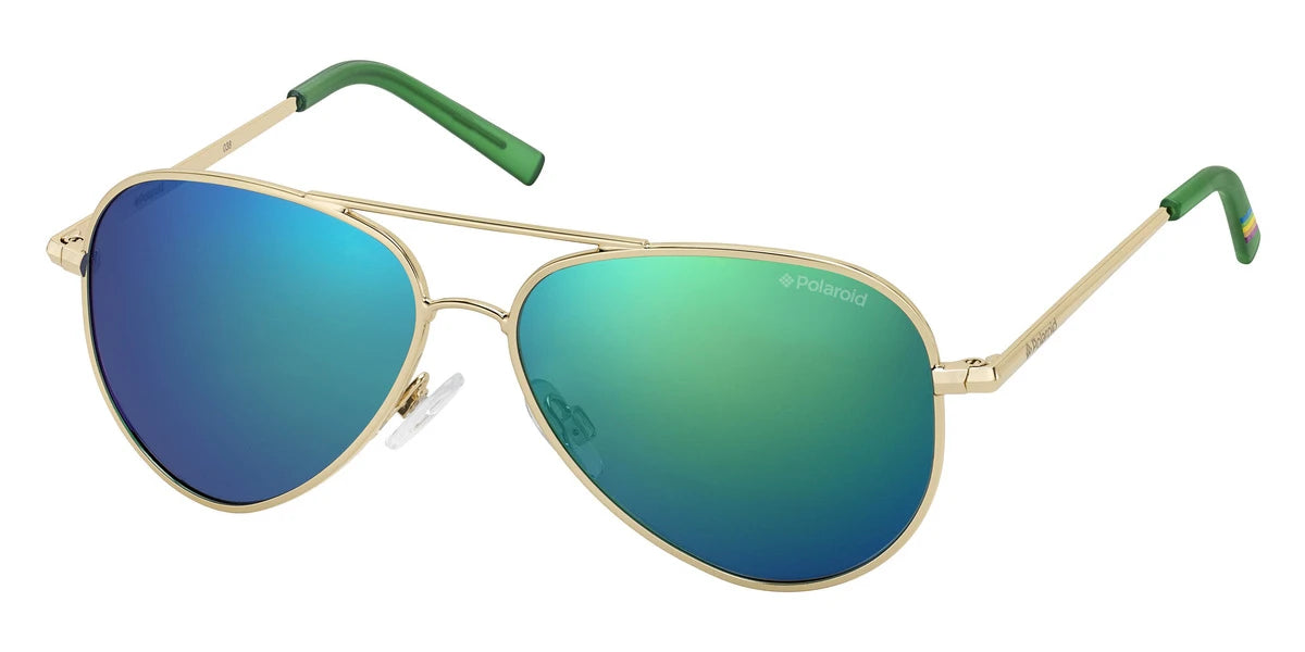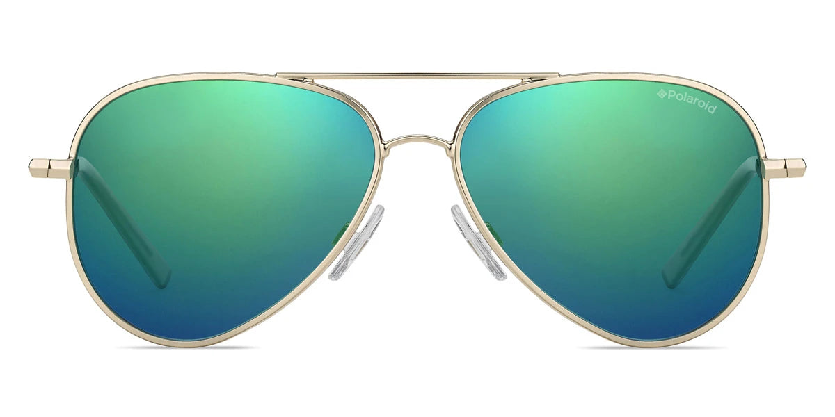 Gold (0J5GJY) Sunglasses with Gray Blue Mirrored Polarized lenses (PLD 8015/N 0J5GJY 52) by Polaroid™. Size: 52-12-135, Shape: Aviator, Material: Metal.