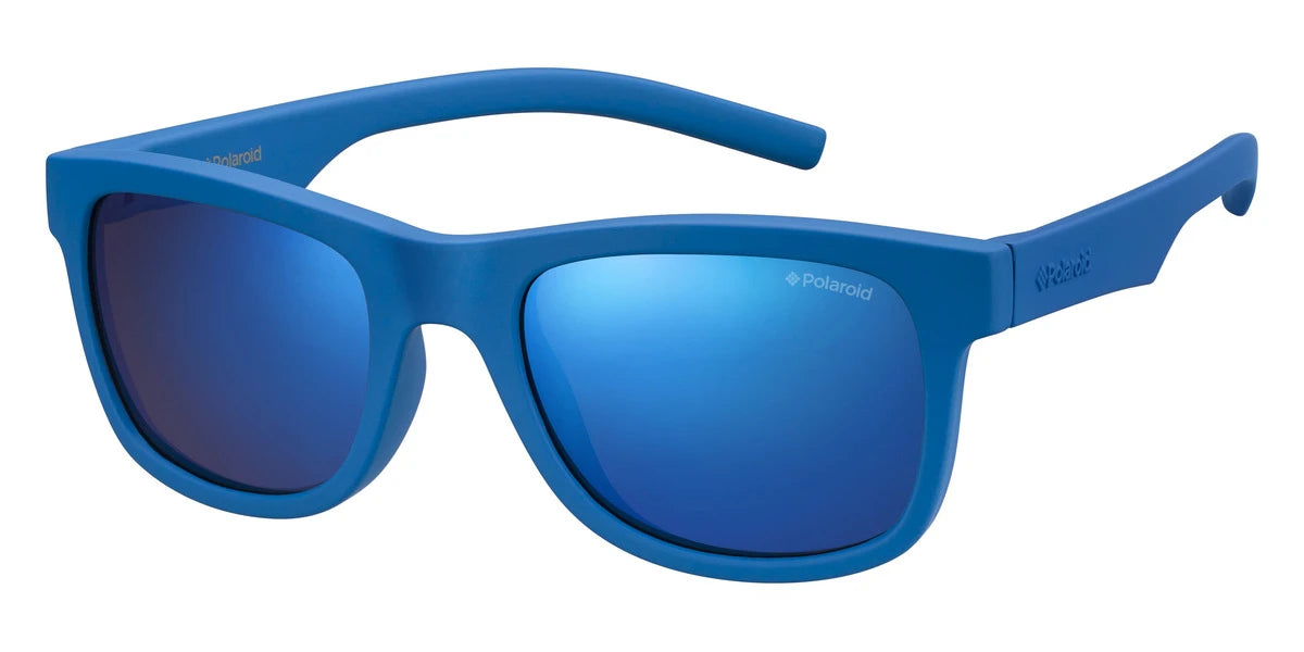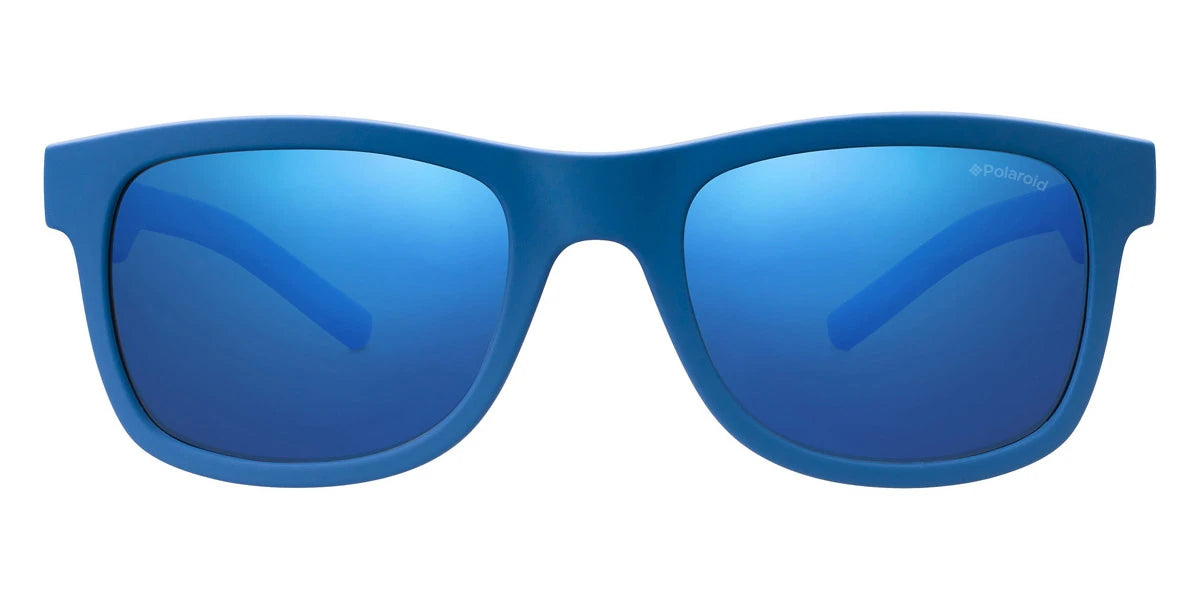Rubber Blue (0CIWJY) Sunglasses with Gray Blue Mirrored Polarized lenses (PLD 8020/S 0CIWJY 46) by Polaroid™. Size: 46-18-124, Shape: Rectangle, Material: Plastic.