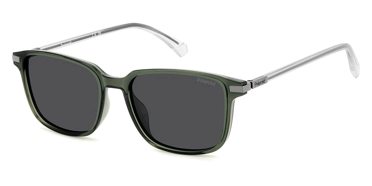 Green Gray (08YWM9) Sunglasses with Gray Polarized lenses (PLD 4169/G/S/X 08YWM9 54) by Polaroid™. Size: 54-17-145, Shape: Square, Material: Polycarbonate and Metal.