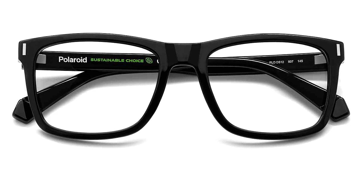 Black (0807) Eyeglasses (PLD D512 0807 54) by Polaroid™. Size: 54-19-145, Shape: Rectangle, Material: Gold Plated Metal.