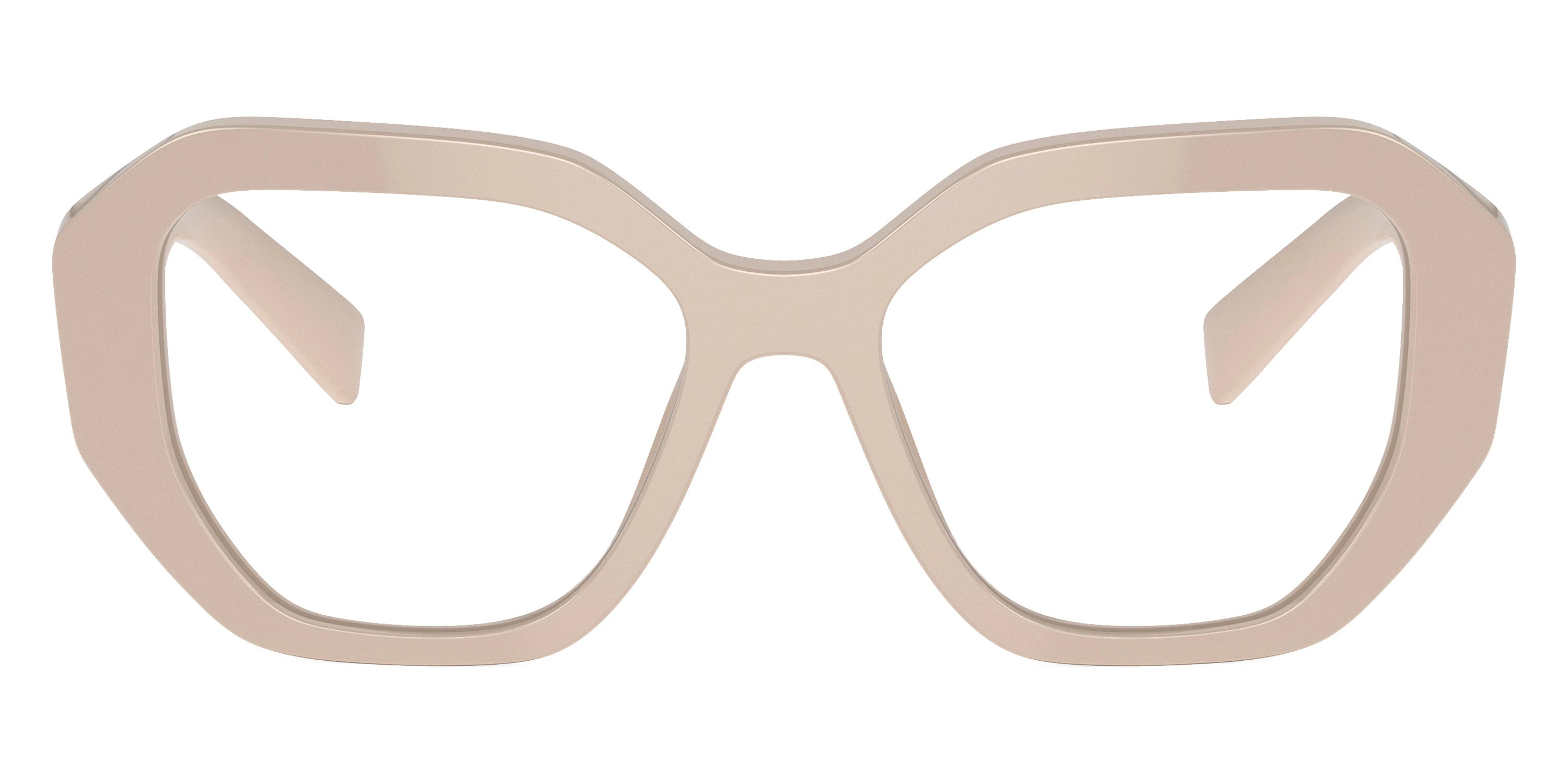 White Ivory (11O1O1) Eyeglasses (PR A07V 11O1O1 50) by Prada. Size: 50-17-140, Shape: Irregular, Material: Acetate.