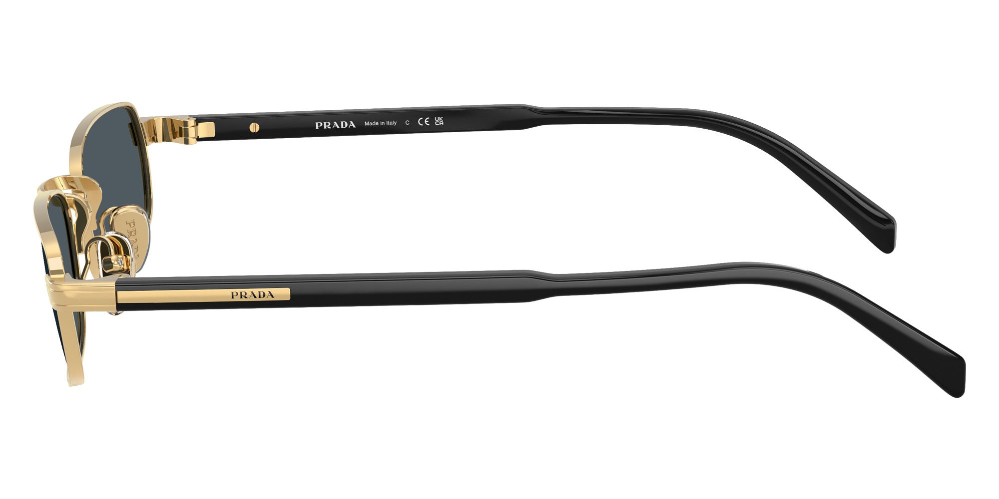 Gold (5AK70B) Sunglasses with Dark Gray lenses (PR B54S 5AK70B 54) by Prada. Size: 54-20-145, Shape: Rectangle, Material: Metal and Acetate.