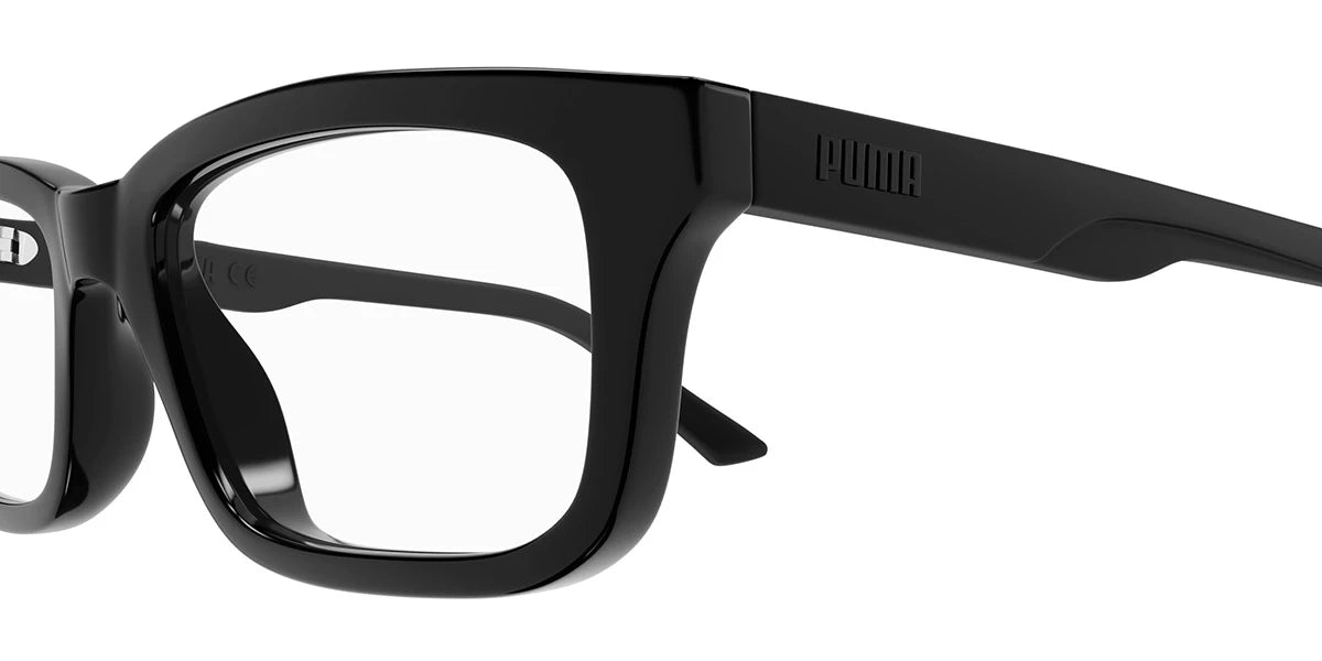 Black (001) Eyeglasses (PJ0068O 001 49) by Puma™. Size: 49-17-130, Shape: Rectangle, Material: Recycled Acetate.
