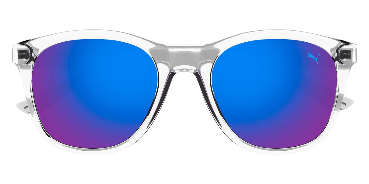 Crystal/Gray (004) Sunglasses with Blue Mirrored lenses (PJ0074S 004 49) by Puma™. Size: 49-18-130, Shape: Square, Material: Recycled Acetate.