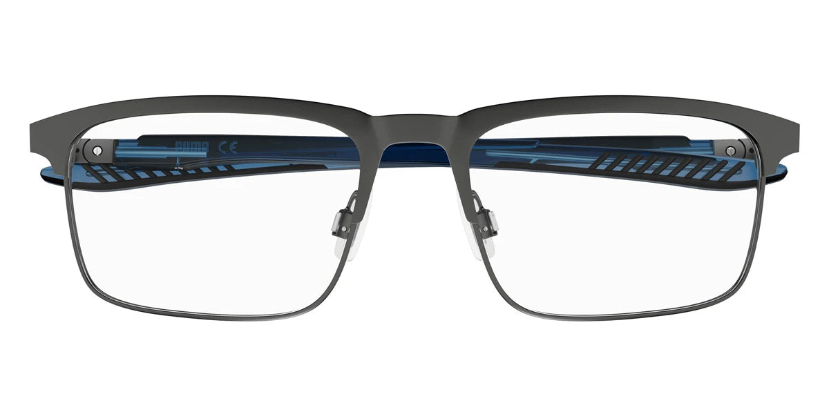 Gunmetal/Gray (002) Eyeglasses (PU0380O 002 55) by Puma™. Size: 55-18-140, Shape: Square, Material: Metal.