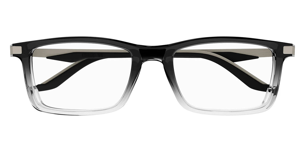 Gray/Silver (002) Eyeglasses (PU0410O 002 54) by Puma™. Size: 54-19-145, Shape: Rectangle, Material: Recycled Acetate.