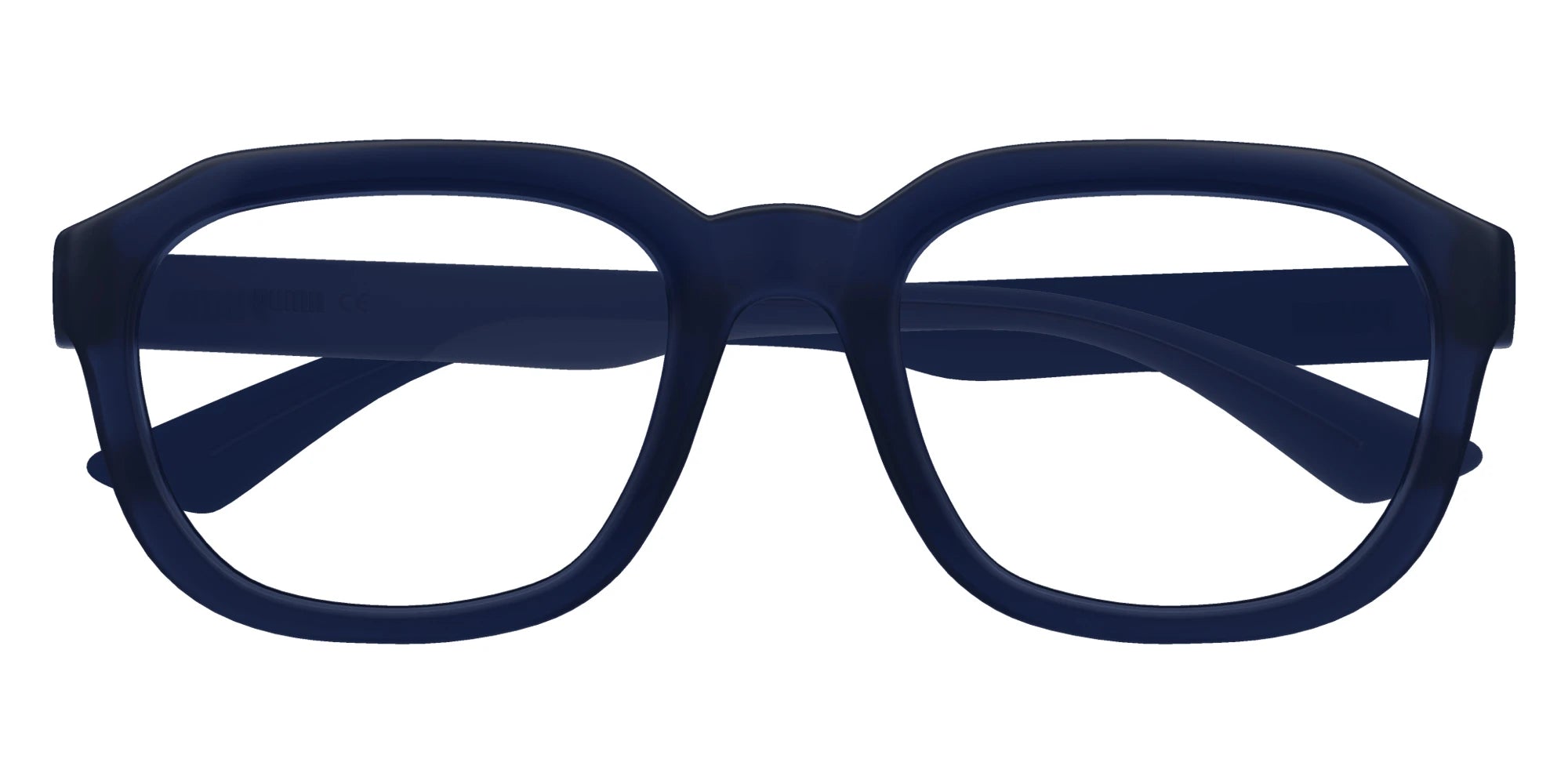 Blue (002) Eyeglasses (PU0464O 002 53) by Puma™. Size: 53-20-140, Shape: Square, Material: Recycled Injection.