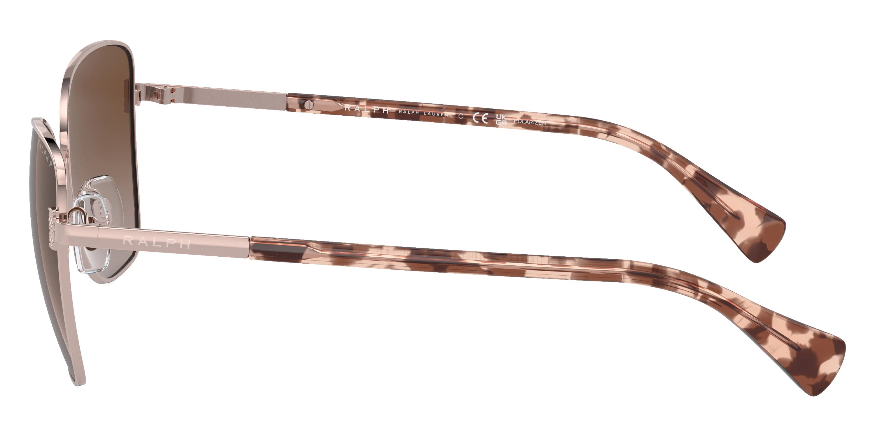 Shiny Rose Gold (9427T5) Sunglasses with Polarized Gradient Brown lenses (RA4146 9427T5 58) by RALPH LAUREN™. Size: 58-16-145, Shape: Butterfly, Material: Metal.