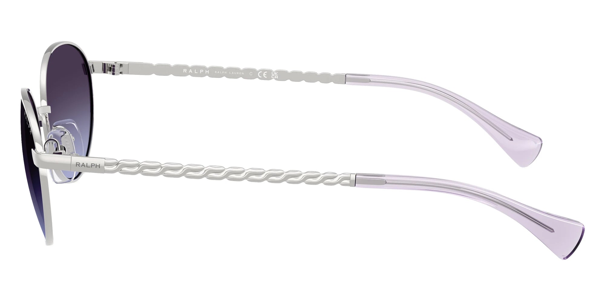 Shiny Silver (90014Q) Sunglasses with Azure Gradient Blue lenses (RA4148 90014Q 55) by RALPH LAUREN™. Size: 55-18-145, Shape: Oval, Material: Metal.