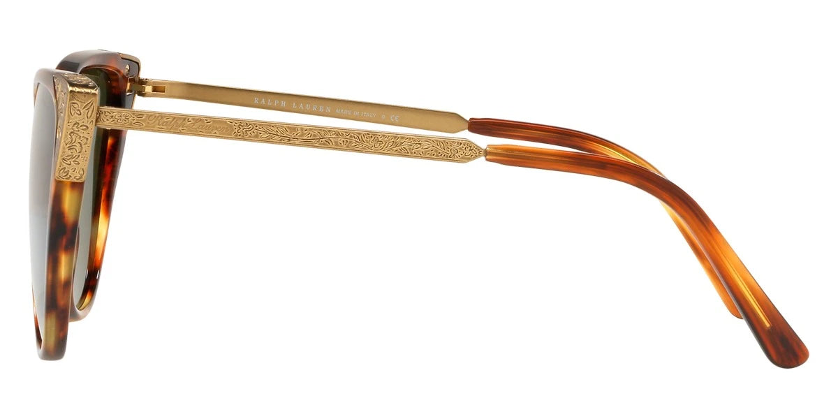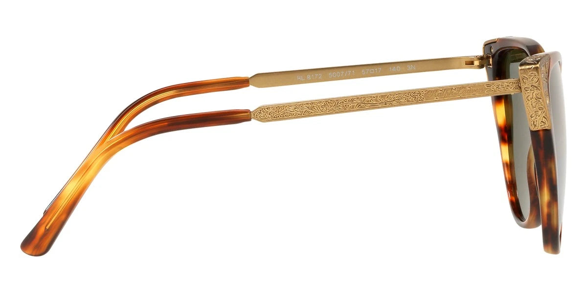Shiny Striped Havana (500771) Sunglasses with Bottle Green lenses (RL8172 500771 57) by RALPH LAUREN™. Size: 57-17-140, Shape: Cat-Eye, Material: Plastic and Metal.