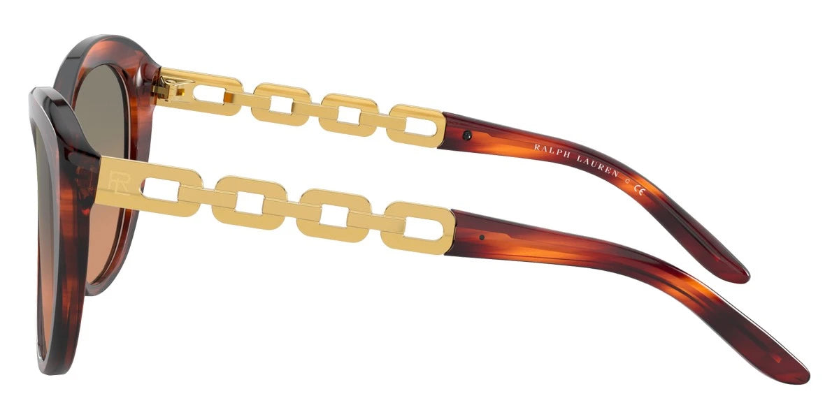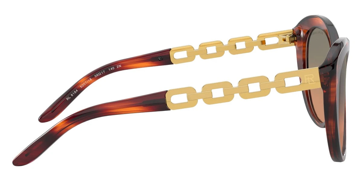 Shiny Striped Havana (500718) Sunglasses with Gray Gradient Orange lenses (RL8184 500718 56) by RALPH LAUREN™. Size: 56-17-140, Shape: Butterfly, Material: Plastic and Metal.