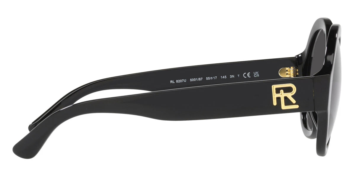 Shiny Black (500187) Sunglasses with Dark Gray lenses (RL8207U 500187 55) by RALPH LAUREN™. Size: 55-17-145, Shape: Round, Material: Plastic.