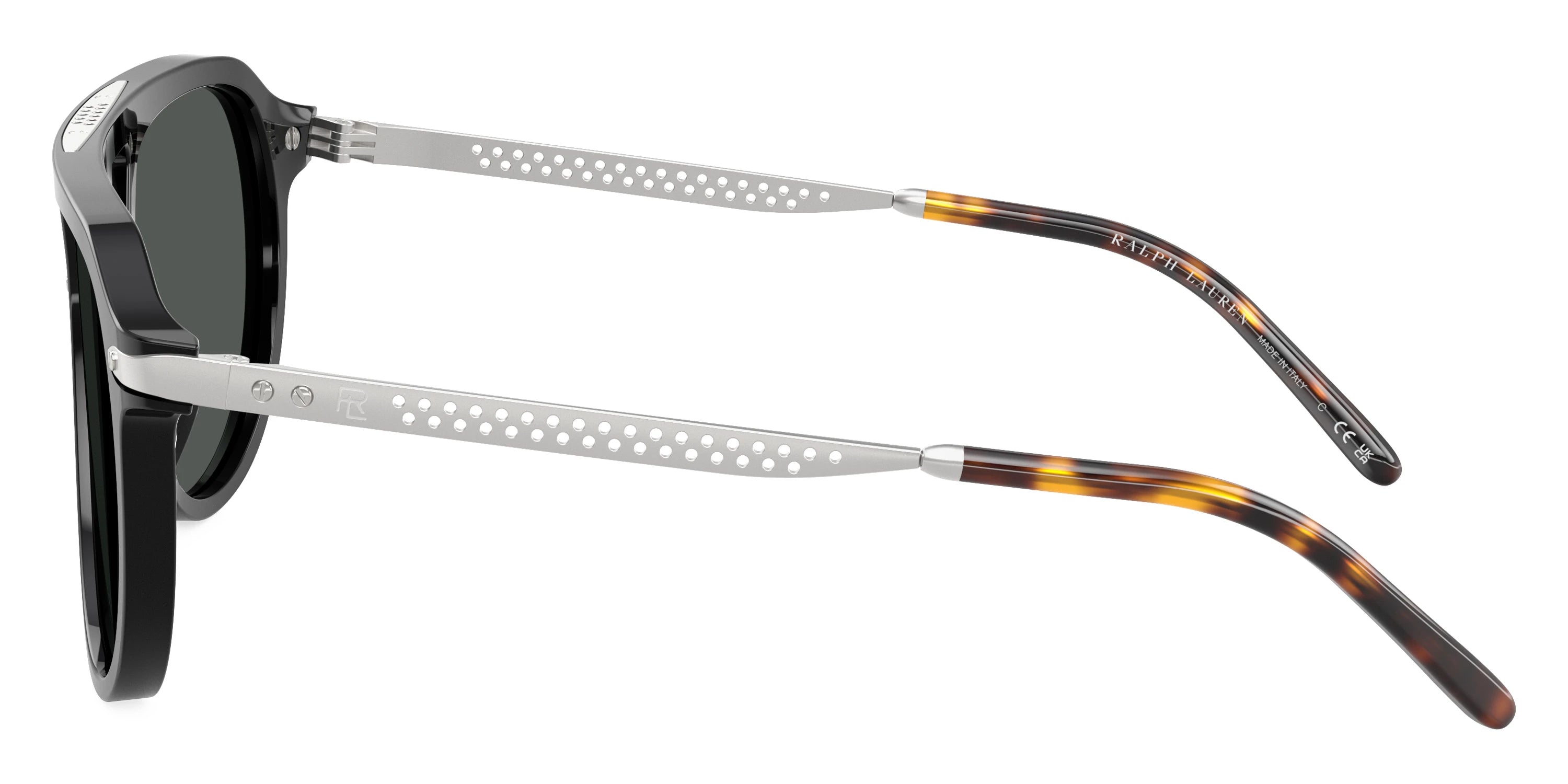 Black/Semi Shiny Silver (500187) Sunglasses with Gray lenses (RL8228U 500187 58) by RALPH LAUREN™. Size: 58-16-145, Shape: Aviator, Material: Acetate and Metal.